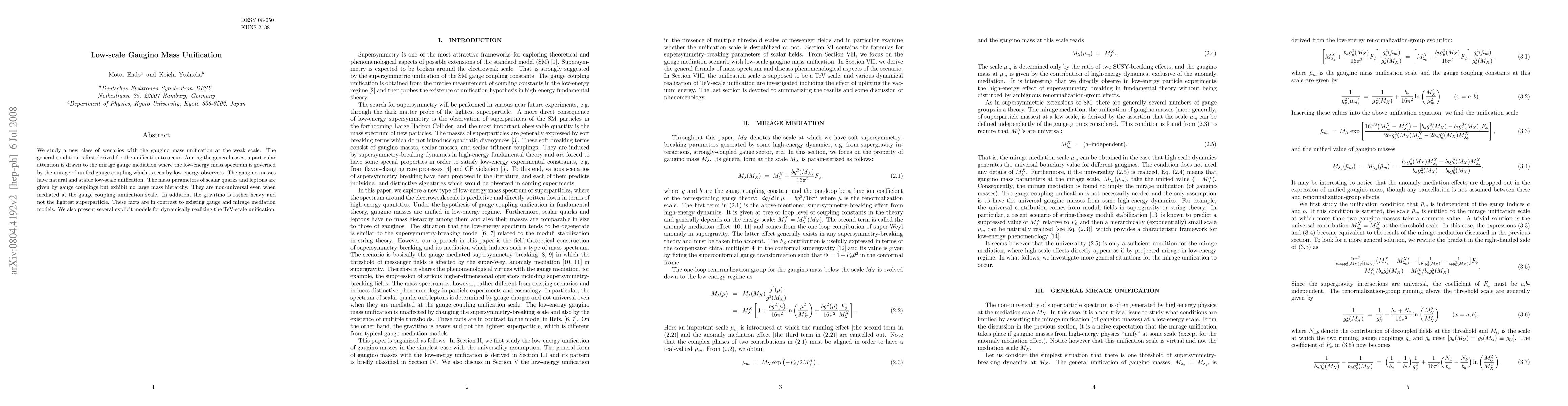 The paper presents a detailed analysis of mirage gauge mediation, deriving conditions for gaugino mass unification at the weak scale and proposing explicit models for TeV-scale unification.