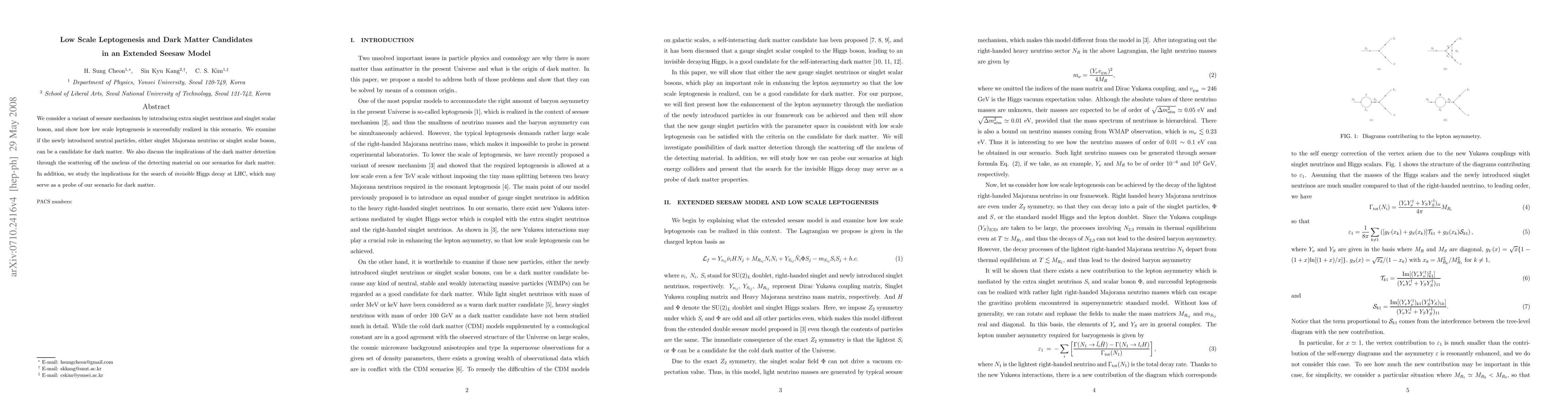 This paper explores an extended seesaw model with extra singlet neutrinos and scalars, demonstrating successful low-scale leptogenesis. It investigates whether the new singlet Majorana neutrinos or scalars can serve as dark matter candidates, discussing their detection implications and the potential for invisible Higgs decay at the LHC to probe the dark matter scenario.