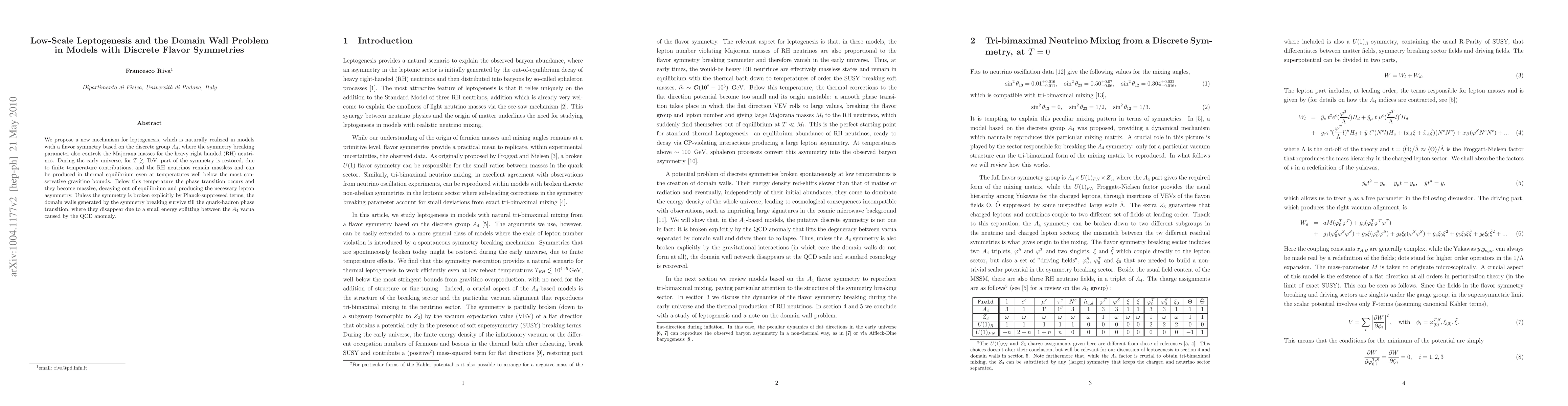 We propose a new mechanism for leptogenesis, which is naturally realized in some models with a flavor symmetry based on the discrete group A_4, where the symmetry breaking parameter also controls the Majorana masses for the heavy right handed (RH) neutrinos. During the early universe, for T>TeV, part of the symmetry is restored, due to finite temperature contributions, and the RH neutrinos remain massless and can be produced in thermal equilibrium even at temperatures well below the most conservative gravitino bounds. Below this temperature the phase transition occurs and they become massive, decaying out of equilibrium and producing the necessary lepton asymmetry. Unless the symmetry is broken explicitly by Planck-suppressed terms, the domain walls generated by the symmetry breaking survive till the quark-hadron phase transition, where they disappear due to a small energy splitting between different vacua caused by the QCD anomaly.