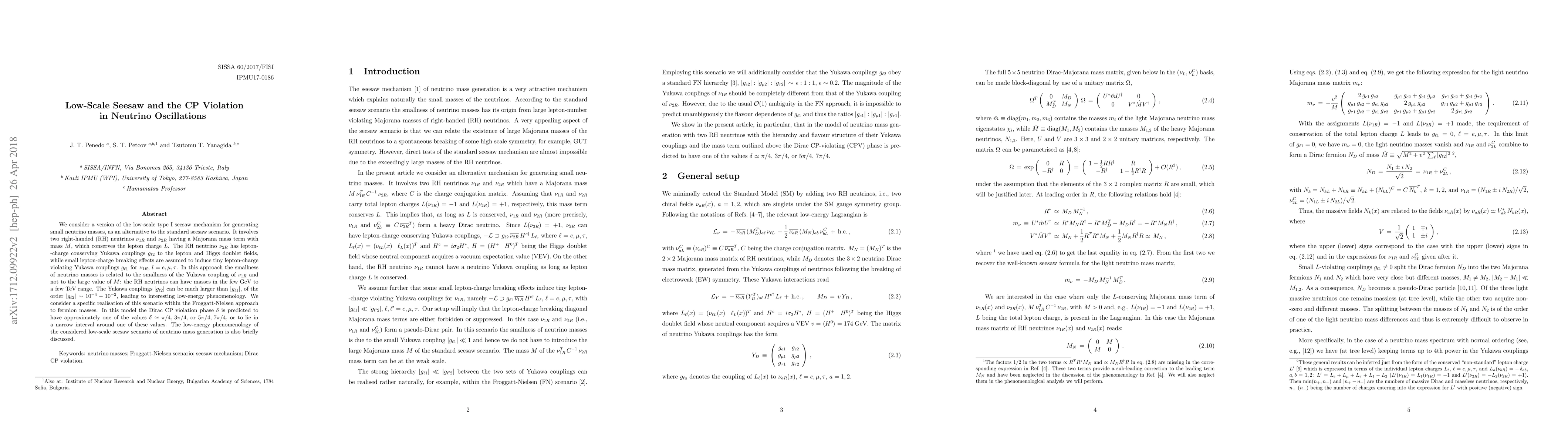 We consider a version of the low-scale type I seesaw mechanism for generating small neutrino masses, as an alternative to the standard seesaw scenario. It involves two right-handed (RH) neutrinos $\nu_{1R}$ and $\nu_{2R}$ having a Majorana mass term with mass $M$, which conserves the lepton charge $L$. The RH neutrino $\nu_{2R}$ has lepton-charge conserving Yukawa couplings $g_{\ell 2}$ to the lepton and Higgs doublet fields, while small lepton-charge breaking effects are assumed to induce tiny lepton-charge violating Yukawa couplings $g_{\ell 1}$ for $\nu_{1R}$, $l=e,\mu,\tau$. In this approach the smallness of neutrino masses is related to the smallness of the Yukawa coupling of $\nu_{1R}$ and not to the large value of $M$: the RH neutrinos can have masses in the few GeV to a few TeV range. The Yukawa couplings $|g_{\ell 2}|$ can be much larger than $|g_{\ell 1}|$, of the order $|g_{\ell 2}| \sim 10^{-4} - 10^{-2}$, leading to interesting low-energy phenomenology. We consider a specific realisation of this scenario within the Froggatt-Nielsen approach to fermion masses. In this model the Dirac CP violation phase $\delta$ is predicted to have approximately one of the values $\delta \simeq \pi/4,\, 3\pi/4$, or $5\pi/4,\, 7\pi/4$, or to lie in a narrow interval around one of these values. The low-energy phenomenology of the considered low-scale seesaw scenario of neutrino mass generation is also briefly discussed.