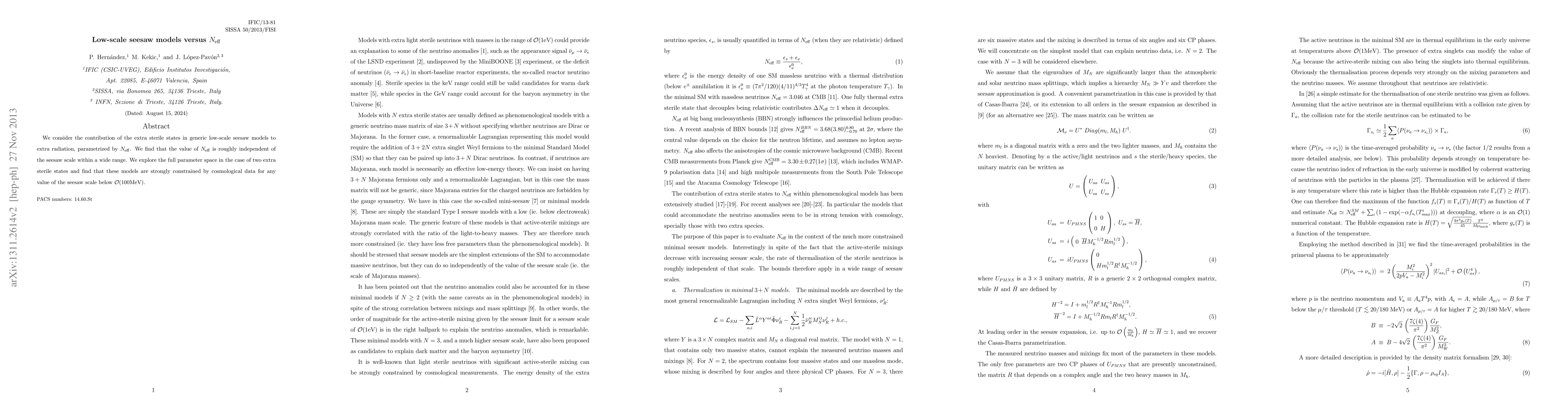 We consider the contribution of the extra sterile states in generic low-scale seesaw models to extra radiation, parametrized by $N_{\rm eff}$. We find that the value of $N_{\rm eff}$ is roughly independent of the seesaw scale within a wide range. We explore the full parameter space in the case of two extra sterile states and find that these models are strongly constrained by cosmological data for any value of the seesaw scale below ${\mathcal O}(100$MeV).