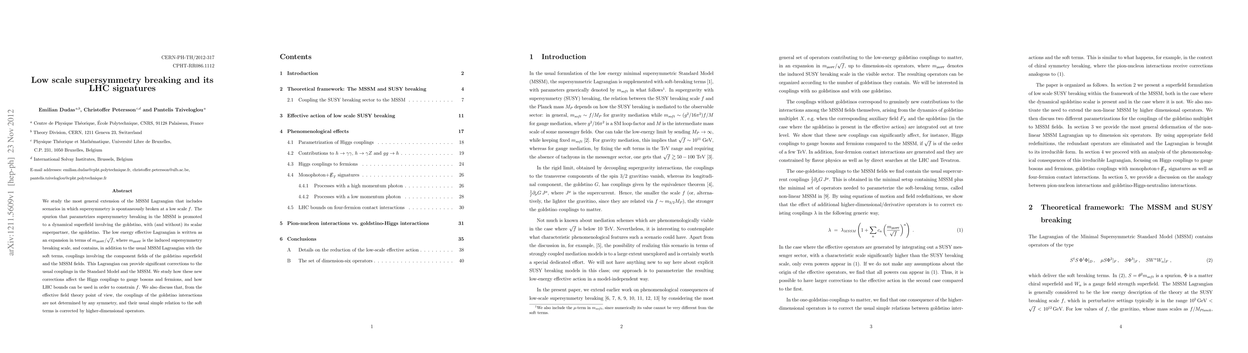 This paper explores low-scale supersymmetry breaking in the MSSM framework, introducing a dynamical superfield for the goldstino and its scalar partner, the sgoldstino. It examines the resulting effective Lagrangian and its implications for LHC signatures, showing how new corrections affect Higgs couplings and how LHC data can constrain the breaking scale.