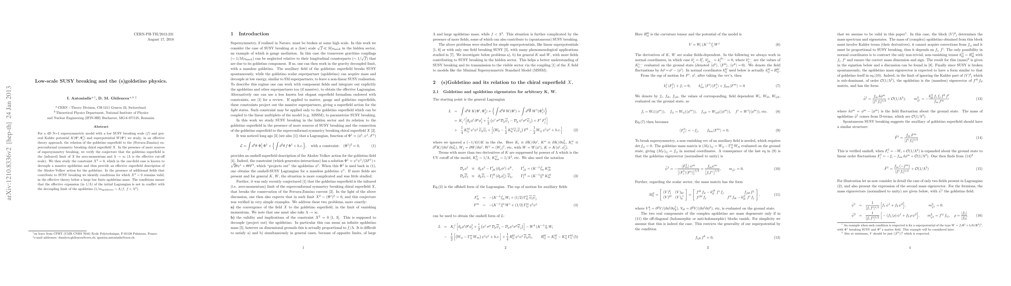 This paper explores the relationship between the goldstino superfield and the superconformal symmetry breaking chiral superfield X in a low-scale SUSY breaking 4D N=1 supersymmetric model. It verifies the conjecture that the goldstino superfield is the infrared limit of X and studies the conditions under which the constraint X^2=0 remains valid, ensuring the effective decoupling of the sgoldstino in the effective theory.