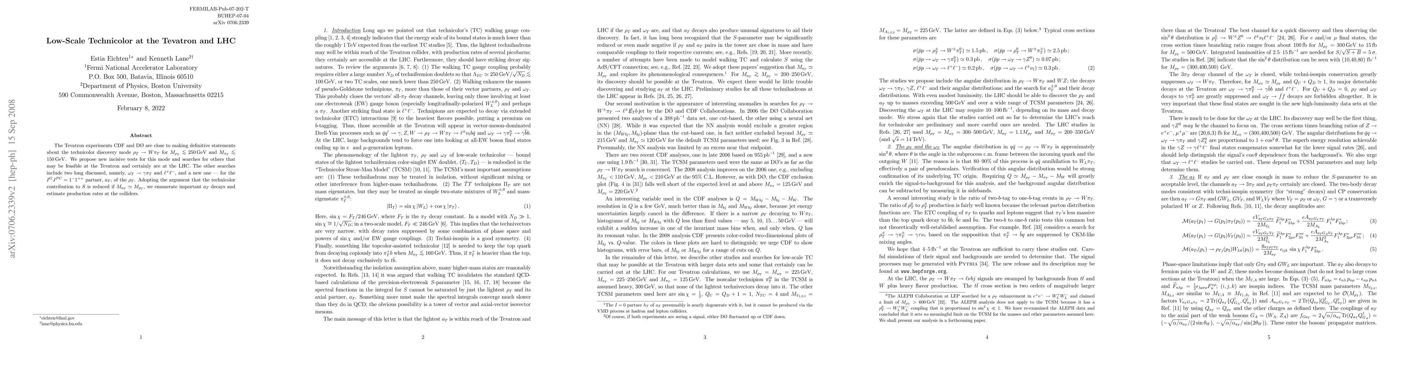 This paper proposes new tests for low-scale technicolor models at the Tevatron and LHC, focusing on the discovery mode rho_T -> W pi_T and exploring additional decay channels like omega_T -> gamma pi_T and l+l-, as well as the new a_T partner of rho_T. It estimates production rates and decay possibilities for these particles within the proposed mass ranges.