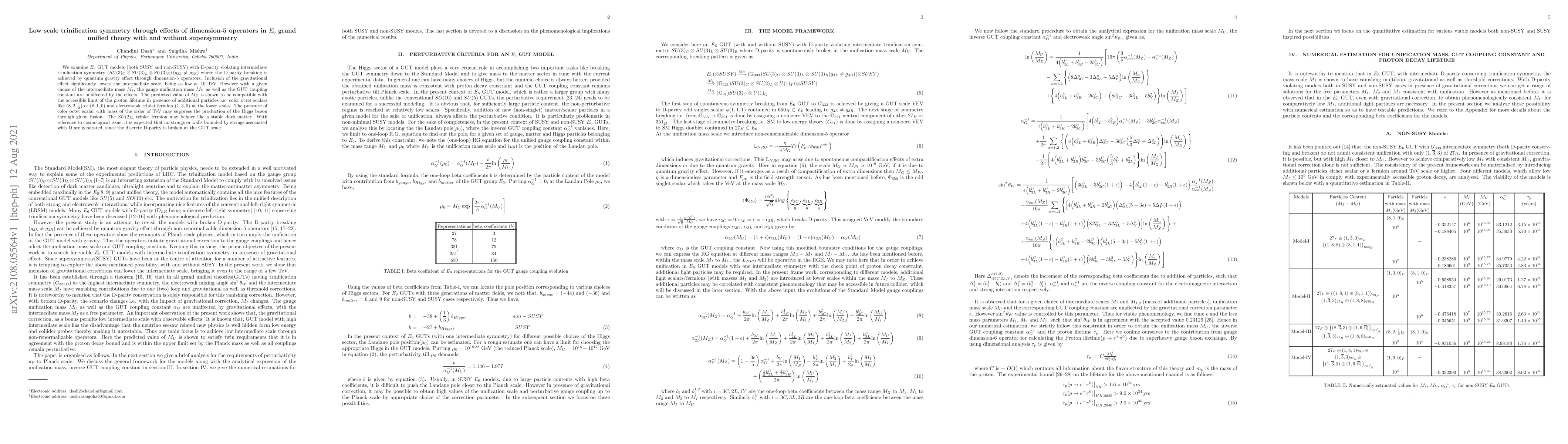 We examine $E_6$ GUT models (both SUSY and non-SUSY) with D-parity violating intermediate trinification symmetry $\left(SU(3)_C\otimes SU(3)_L\otimes SU(3)_R\right)(g_{3L}\neq g_{3R})$ where the D-parity breaking is achieved by quantum gravity effect through dimension-5 operators. Inclusion of the gravitational effect significantly lowers the intermediate scale, being as low as $10$ TeV. However with a given choice of the intermediate mass $M_I$, the gauge unification mass $M_U$ as well as the GUT coupling constant are unaffected by the effects. The predicted value of $M_U$ is shown to be compatible with the accessible limit of the proton lifetime in presence of additional particles i.e. color octet scalars like $(8,2,\frac{1}{2})$ or $(8,1,0)$ and electroweak triplet fermion $(1,3,0)$ at the lower scales. The presence of color octet scalar with mass of the order of TeV may suppress the production of the Higgs boson through gluon fusion. The $SU(2)_L$ triplet fermion may behave like a stable dark matter. With reference to cosmological issue, it is expected that no strings or walls bounded by strings associated with D are generated, since the discrete D-parity is broken at the GUT scale.