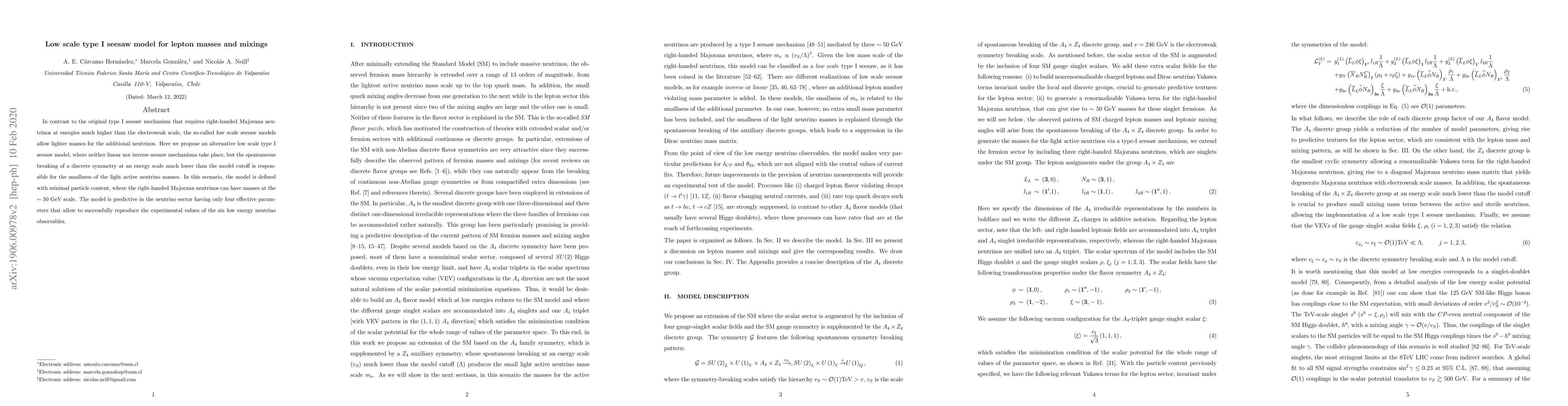 This paper proposes a low scale type I seesaw model for generating light neutrino masses without invoking high-energy mechanisms, instead relying on a discrete symmetry breaking at a lower energy scale. The model features minimal particle content and right-handed neutrinos at the ~50 GeV scale, predicting four parameters to reproduce experimental neutrino mixing data.