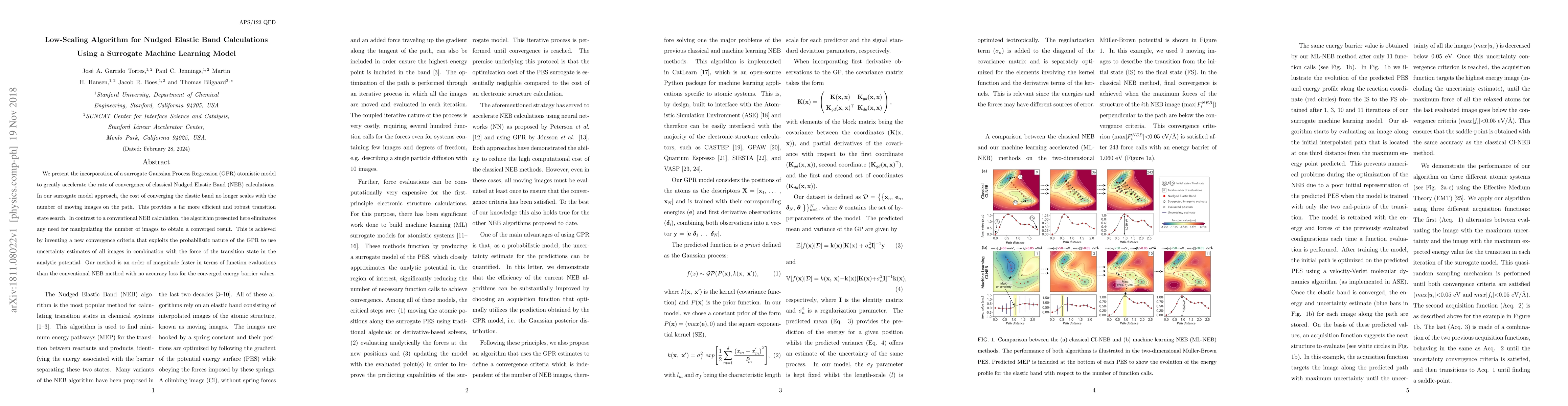 This paper introduces a low-scaling algorithm that accelerates Nudged Elastic Band (NEB) calculations using a Gaussian Process Regression (GPR) surrogate model, significantly reducing computational cost without sacrificing accuracy. The new convergence criteria leverages GPR's uncertainty estimates, making the method an order of magnitude faster than traditional NEB methods.
