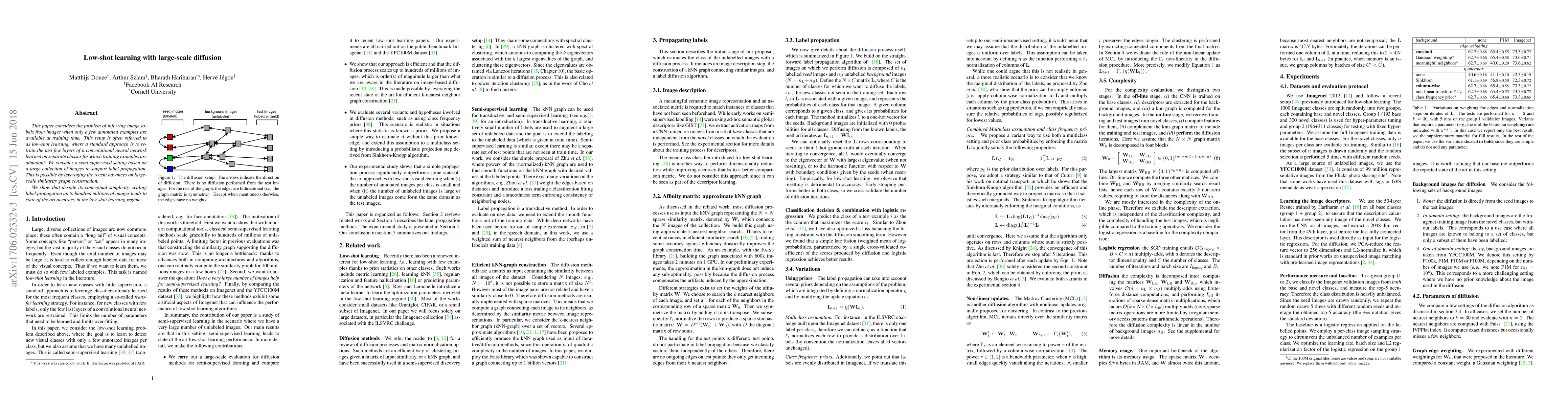This paper considers the problem of inferring image labels from images when only a few annotated examples are available at training time. This setup is often referred to as low-shot learning, where a standard approach is to re-train the last few layers of a convolutional neural network learned on separate classes for which training examples are abundant. We consider a semi-supervised setting based on a large collection of images to support label propagation. This is possible by leveraging the recent advances on large-scale similarity graph construction. We show that despite its conceptual simplicity, scaling label propagation up to hundred millions of images leads to state of the art accuracy in the low-shot learning regime.