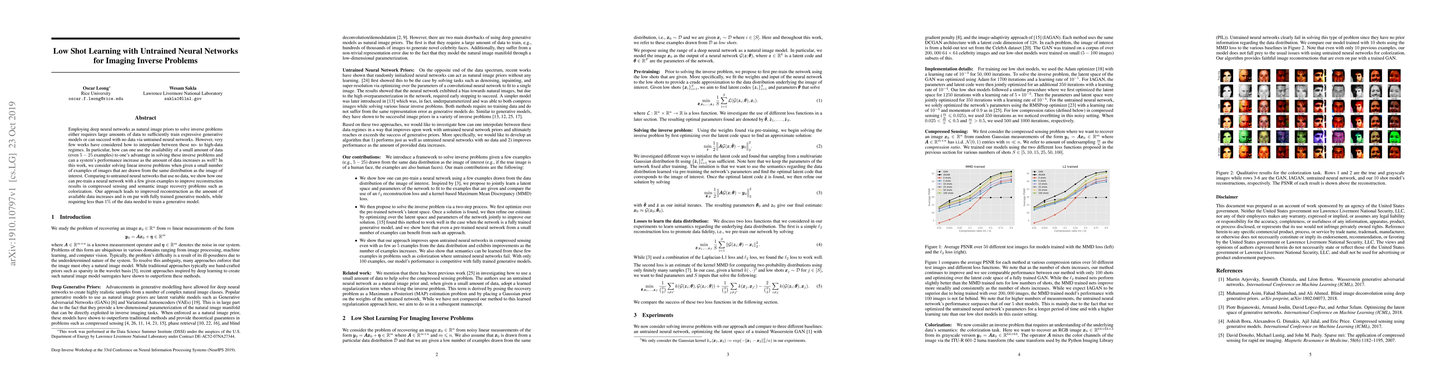 This paper explores the use of untrained neural networks for solving imaging inverse problems with limited data, demonstrating how pre-training a neural network with a small number of examples can significantly improve reconstruction results in compressed sensing and colorization tasks. The approach achieves performance comparable to fully trained generative models while using less than 1% of the data required for training.