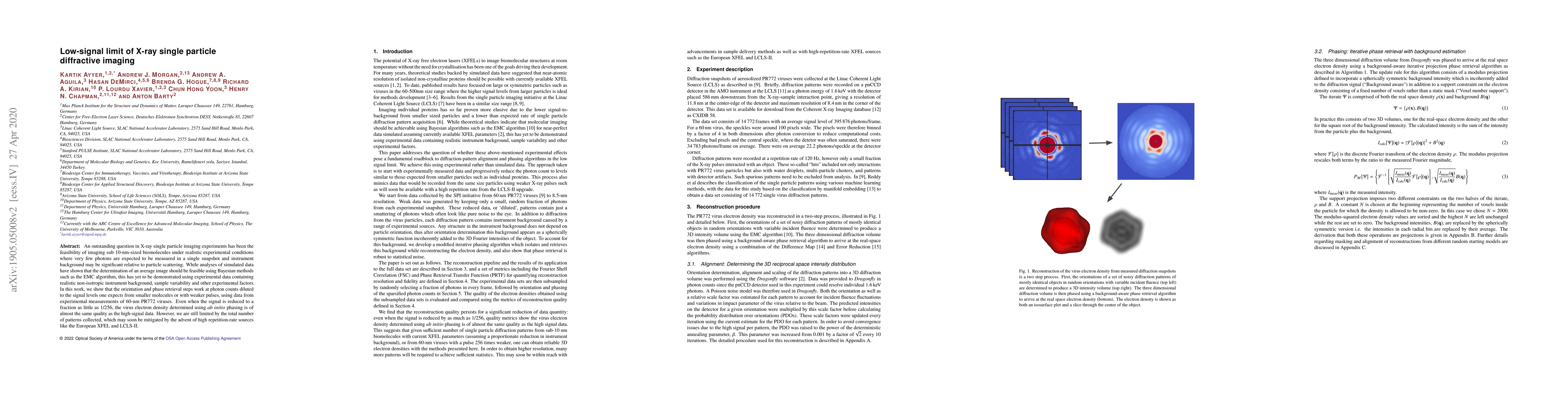 An outstanding question in X-ray single particle imaging experiments has been the feasibility of imaging sub 10-nm-sized biomolecules under realistic experimental conditions where very few photons are expected to be measured in a single snapshot and instrument background may be significant relative to particle scattering. While analyses of simulated data have shown that the determination of an average image should be feasible using Bayesian methods such as the EMC algorithm, this has yet to be demonstrated using experimental data containing realistic non-isotropic instrument background, sample variability and other experimental factors. In this work, we show that the orientation and phase retrieval steps work at photon counts diluted to the signal levels one expects from smaller molecules or with weaker pulses, using data from experimental measurements of 60-nm PR772 viruses. Even when the signal is reduced to a fraction as little as 1/256, the virus electron density determined using ab initio phasing is of almost the same quality as the high-signal data. However, we are still limited by the total number of patterns collected, which may soon be mitigated by the advent of high repetition-rate sources like the European XFEL and LCLS-II.