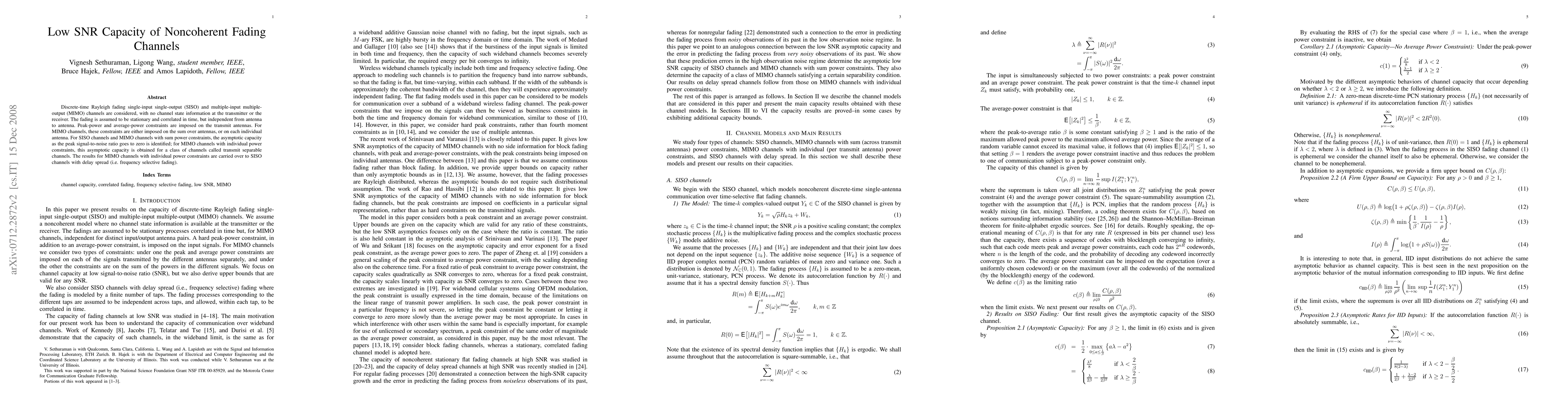This paper investigates the low signal-to-noise ratio (SNR) capacity of noncoherent fading channels, including both single-input single-output (SISO) and multiple-input multiple-output (MIMO) configurations. It identifies the asymptotic capacity under peak and average power constraints for SISO and MIMO channels as SNR approaches zero, extending the results to frequency selective fading for SISO channels.