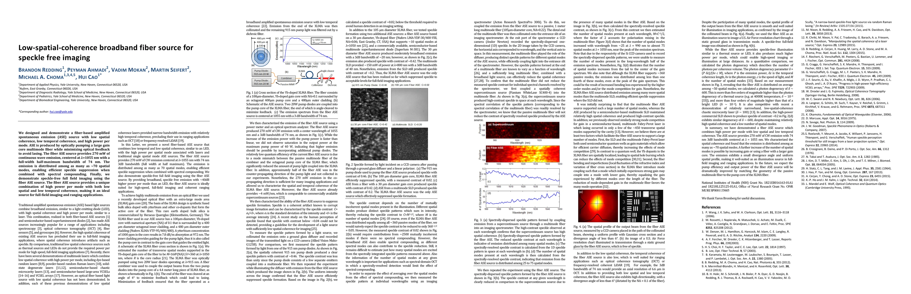 This paper presents a fiber-based amplified spontaneous emission (ASE) source with low spatial and temporal coherence, achieving 270 mW of continuous wave emission at 1055 nm. The design enables speckle suppression and demonstrates speckle-free full field imaging, making it suitable for imaging and ranging applications.