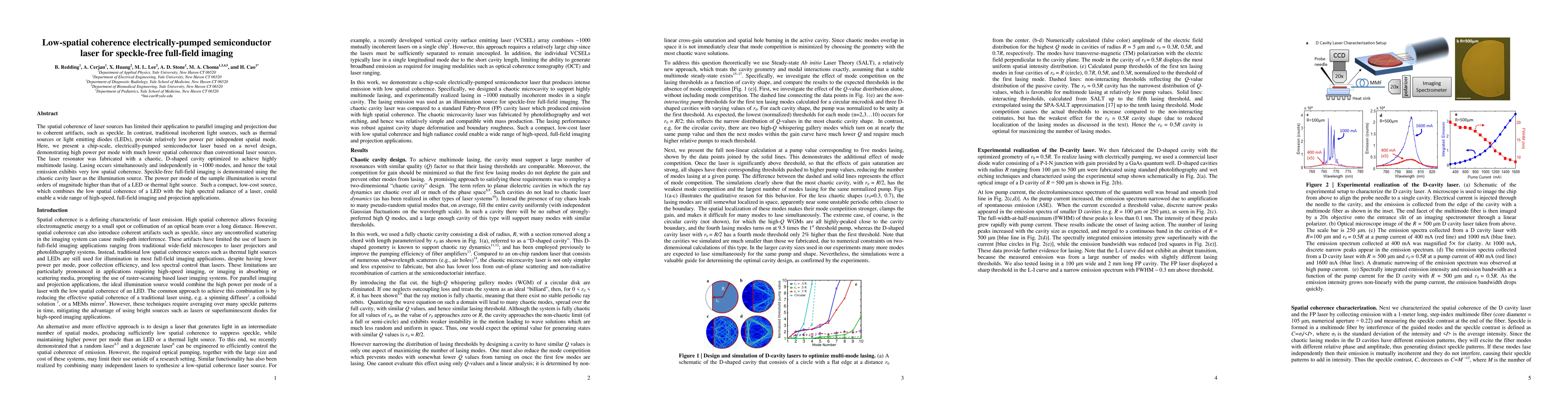 This paper presents a chip-scale, electrically-pumped semiconductor laser with low spatial coherence, enabling speckle-free full-field imaging. The chaotic, D-shaped cavity design supports lasing in ~1000 modes, achieving high power per mode and low spatial coherence, outperforming LEDs and thermal sources.