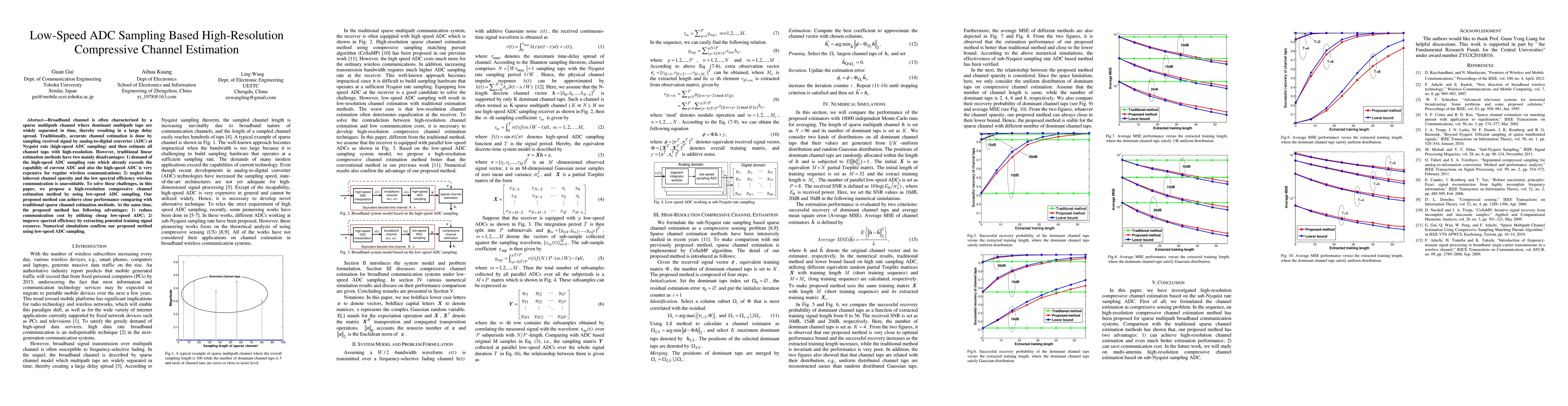 Broadband channel is often characterized by a sparse multipath channel where dominant multipath taps are widely separated in time, thereby resulting in a large delay spread. Traditionally, accurate channel estimation is done by sampling received signal by analog-to-digital converter (ADC) at Nyquist rate (high-speed ADC sampling) and then estimate all channel taps with high-resolution. However, traditional linear estimation methods have two mainly disadvantages: 1) demand of the high-speed ADC sampling rate which already exceeds the capability of current ADC and also the high-speed ADC is very expensive for regular wireless communications; 2) neglect the inherent channel sparsity and the low spectral efficiency wireless communication is unavoidable. To solve these challenges, in this paper, we propose a high-resolution compressive channel estimation method by using low-speed ADC sampling. Our proposed method can achieve close performance comparing with traditional sparse channel estimation methods. At the same time, the proposed method has following advantages: 1) reduce communication cost by utilizing cheap low-speed ADC; 2) improve spectral efficiency by extracting potential training signal resource. Numerical simulations confirm our proposed method using low-speed ADC sampling.