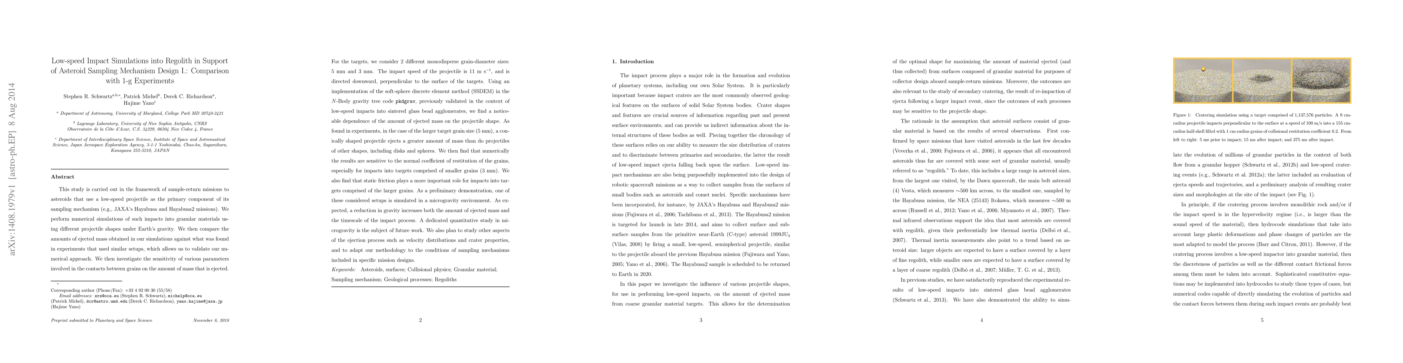This study investigates the impact of low-speed projectiles into regolith for asteroid sampling missions, comparing numerical simulations with 1-g experiments. The simulations reveal a significant dependence of ejected mass on projectile shape and highlight the influence of grain size and static friction, validated against experimental data.