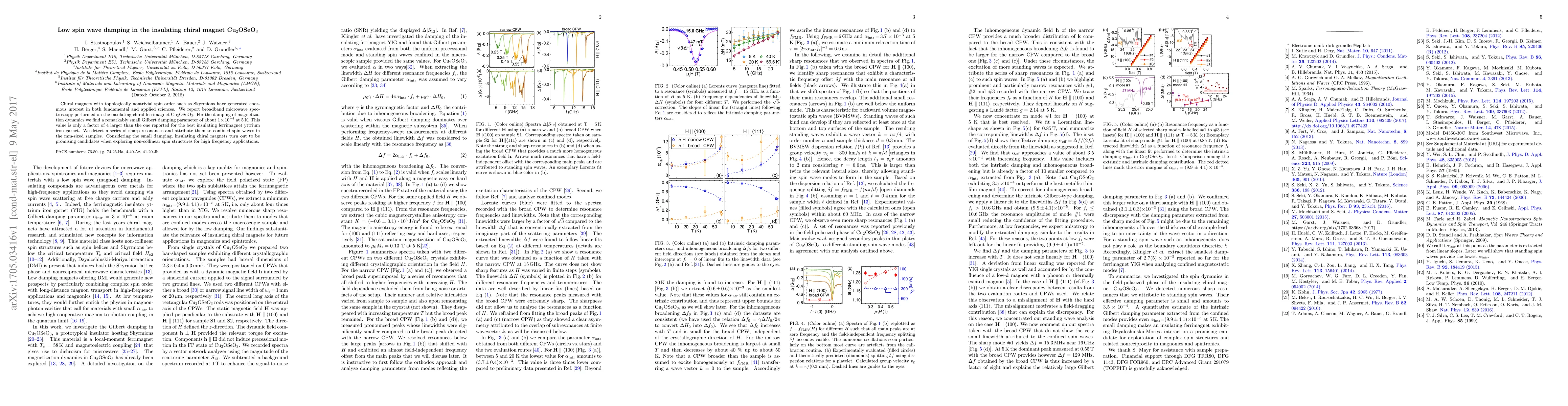 Chiral magnets with topologically nontrivial spin order such as Skyrmions have generated enormous interest in both fundamental and applied sciences. We report broadband microwave spectroscopy performed on the insulating chiral ferrimagnet Cu$_{2}$OSeO$_{3}$. For the damping of magnetization dynamics we find a remarkably small Gilbert damping parameter of about $1\times10^{-4}$ at 5 K. This value is only a factor of 4 larger than the one reported for the best insulating ferrimagnet yttrium iron garnet. We detect a series of sharp resonances and attribute them to confined spin waves in the mm-sized samples. Considering the small damping, insulating chiral magnets turn out to be promising candidates when exploring non-collinear spin structures for high frequency applications.