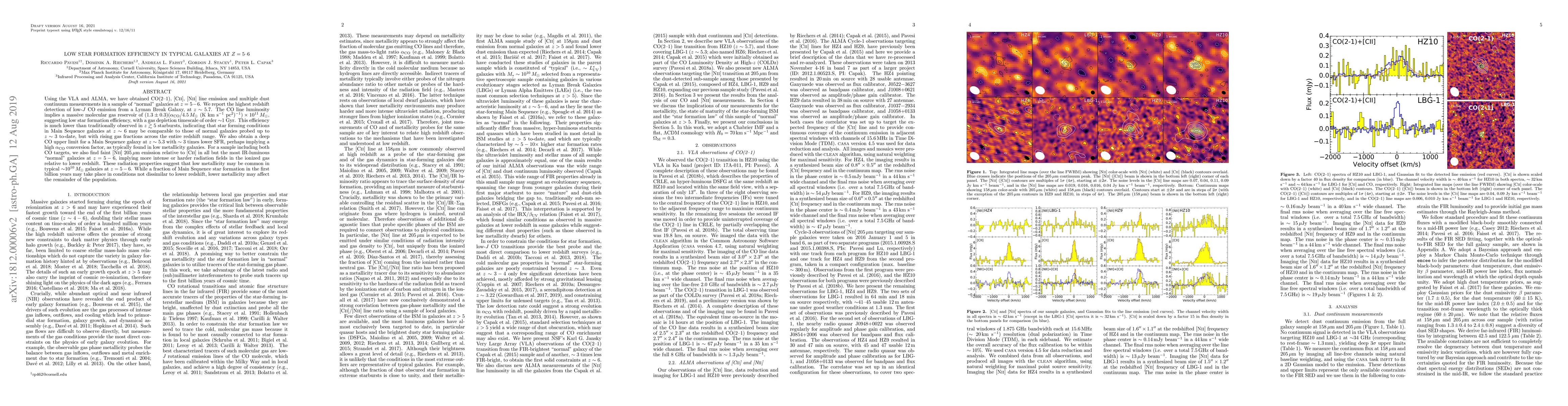 This study reveals low star formation efficiency in typical galaxies at $z=5-6$ using VLA and ALMA observations, finding a massive molecular gas reservoir but a gas depletion timescale of around 1 Gyr. The results suggest that star forming conditions in these galaxies are more akin to those of normal galaxies at lower redshifts, with indications of common low metallicity.