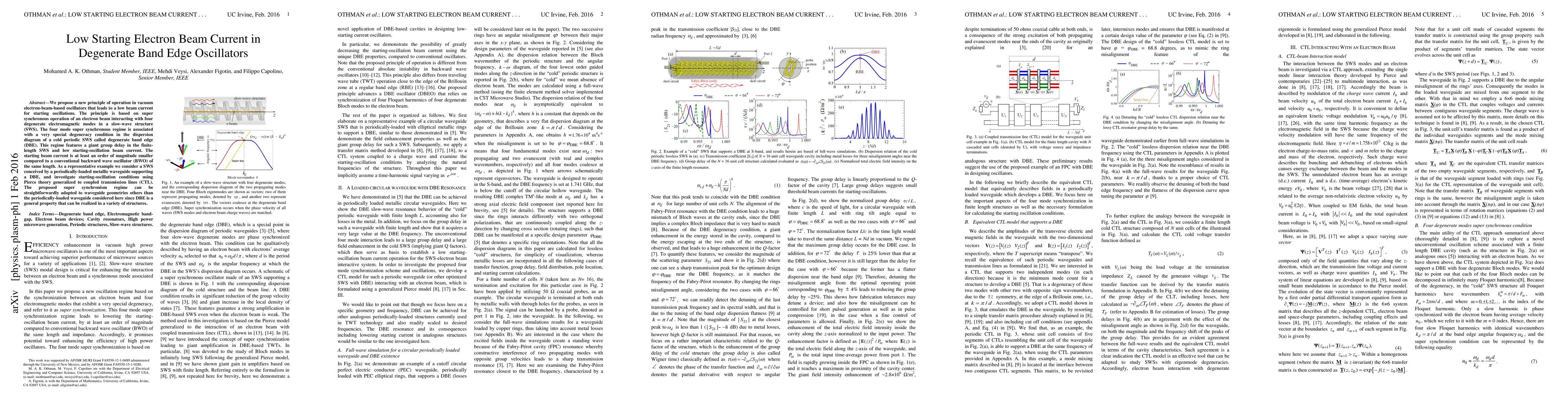 This paper proposes a novel operation principle for vacuum electron-beam oscillators that significantly reduces starting beam current through super synchronous interaction with four degenerate electromagnetic modes in a slow-wave structure. The degenerate band edge regime exhibits a giant group delay and is at least an order of magnitude more efficient than conventional backward wave oscillators.