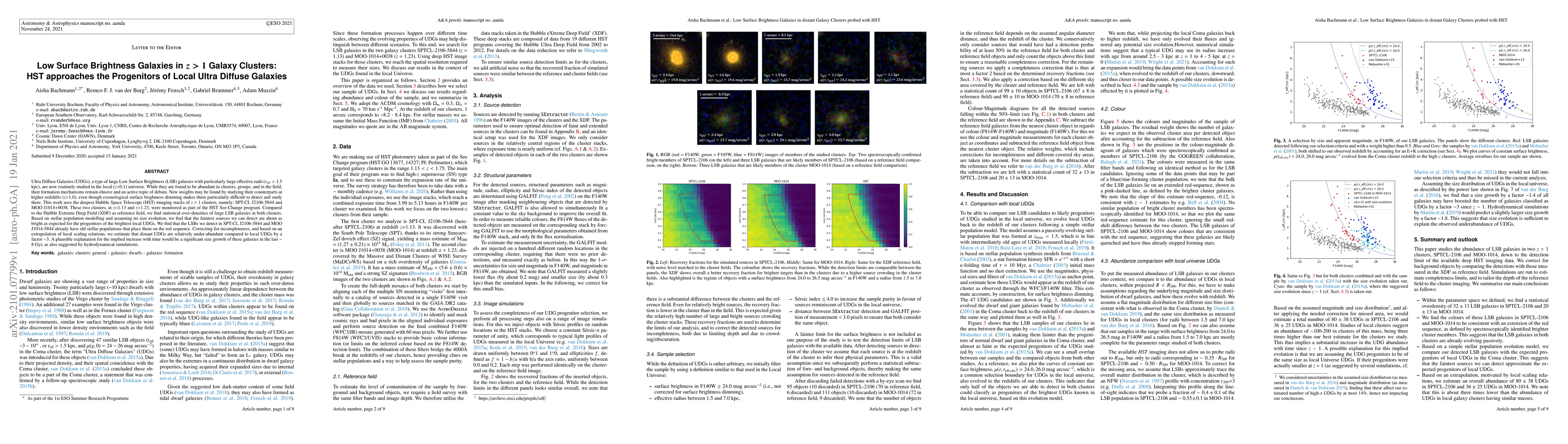 Ultra Diffuse Galaxies (UDGs), a type of large Low Surface Brightness (LSB) galaxies with particularly large effective radii (r_eff > 1.5 kpc), are now routinely studied in the local (z<0.1) universe. While they are found to be abundant in clusters, groups, and in the field, their formation mechanisms remain elusive and an active topic of debate. New insights may be found by studying their counterparts at higher redshifts (z>1.0), even though cosmological surface brightness dimming makes them particularly diffcult to detect and study there. This work uses the deepest Hubble Space Telescope (HST) imaging stacks of z > 1 clusters, namely: SPT-CL J2106-5844 and MOO J1014+0038. These two clusters, at z=1.13 and z=1.23, were monitored as part of the HST See-Change program. Compared to the Hubble Extreme Deep Field (XDF) as reference field, we find statistical over-densities of large LSB galaxies in both clusters. Based on stellar population modelling and assuming no size evolution, we find that the faintest sources we can detect are about as bright as expected for the progenitors of the brightest local UDGs. We find that the LSBs we detect in SPT-CL J2106-5844 and MOO J1014-5844 already have old stellar populations that place them on the red sequence. Correcting for incompleteness, and based on an extrapolation of local scaling relations, we estimate that distant UDGs are relatively under-abundant compared to local UDGs by a factor ~ 3. A plausible explanation for the implied increase with time would be a significant size growth of these galaxies in the last ~ 8 Gyr, as also suggested by hydrodynamical simulations.