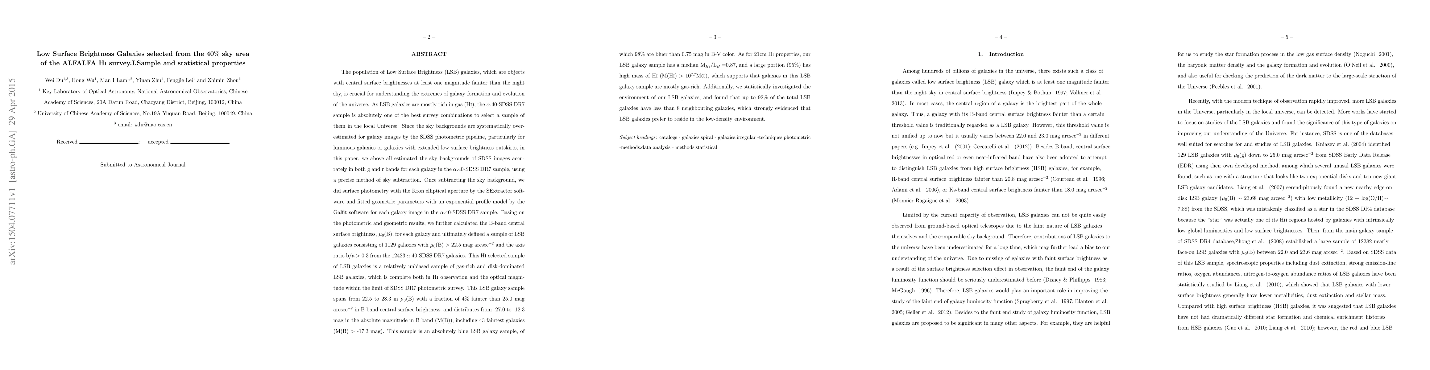 The population of Low Surface Brightness (LSB) galaxies is crucial for understanding the extremes of galaxy formation and evolution of the universe. As LSB galaxies are mostly rich in gas (HI), the alpha.40-SDSS DR7 sample is absolutely one of the best survey combinations to select a sample of them in the local Universe. Since the sky backgrounds are systematically overestimated for galaxy images by the SDSS photometric pipeline, particularly for luminous galaxies or galaxies with extended low surface brightness outskirts, in this paper, we above all estimated the sky backgrounds of SDSS images in the alpha.40-SDSS DR7 sample, using a precise method of sky subtraction. Once subtracting the sky background, we did surface photometry with the Kron elliptical aperture and fitted geometric parameters with an exponential profile model for each galaxy image. Basing on the photometric and geometric results, we further calculated the B-band central surface brightness, mu_{0}(B), for each galaxy and ultimately defined a sample of LSB galaxies consisting of 1129 galaxies with mu_{0}(B) > 22.5 mag arcsec^{-2} and the minor-to-major axis ratio b/a > 0.3. This HI-selected LSB galaxy sample from the alpha.40-SDSS DR7 is a relatively unbiased sample of gas-rich and disk-dominated LSB galaxies, which is complete both in HI observation and the optical magnitude within the limit of SDSS DR7 photometric survey. We made analysis on optical and radio 21cm HI properties of this LSB galaxy sample. Additionally, we statistically investigated the environment of our LSB galaxies, and found that up to 92% of the total LSB galaxies have less than 8 neighbouring galaxies, which strongly evidenced that LSB galaxies prefer to reside in the low-density environment.