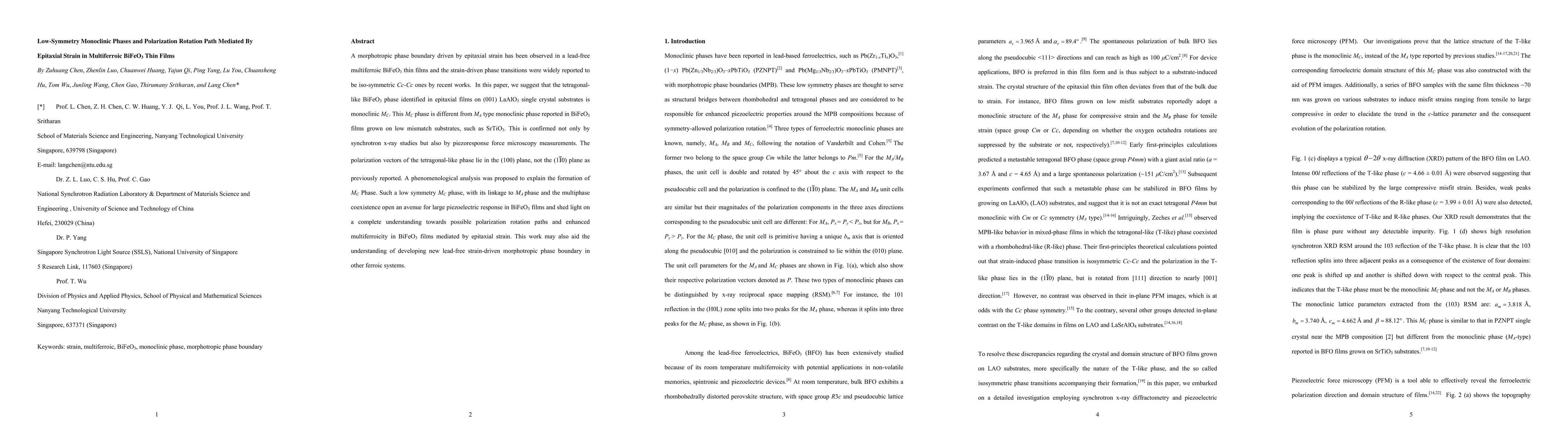 This study reveals a monoclinic MC phase in epitaxially strained BiFeO3 thin films on LaAlO3 substrates, identified via synchrotron x-ray and piezoresponse force microscopy. The polarization vectors lie in the (100) plane, differing from previous reports, and this low-symmetry phase opens pathways for enhanced multiferroicity and piezoelectric response in lead-free materials.