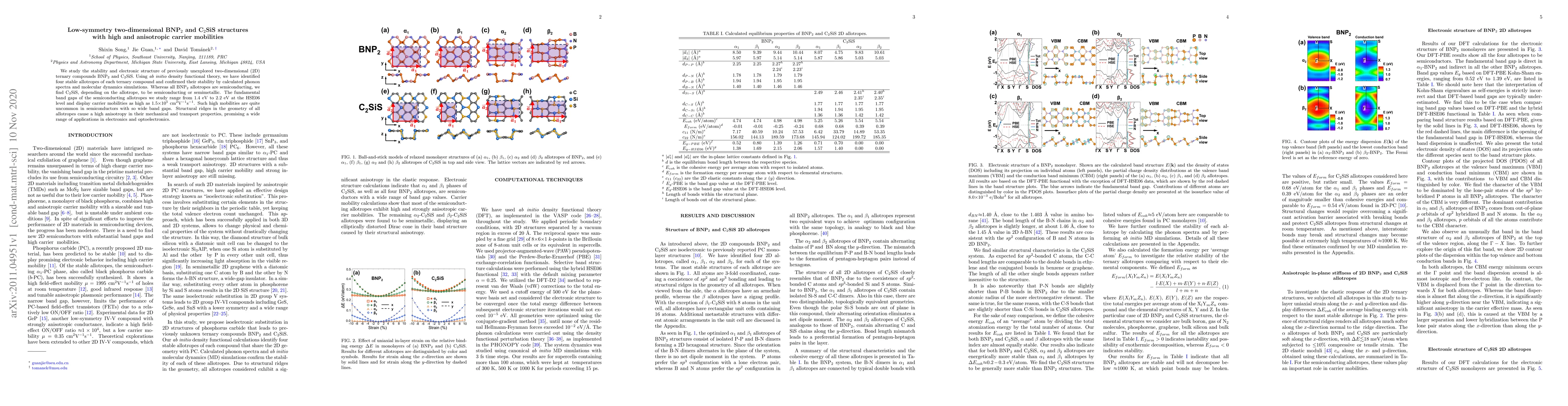We study the stability and electronic structure of previously unexplored two-dimensional (2D) ternary compounds BNP$_2$ and C$_2$SiS. Using $ab$ $initio$ density functional theory, we have identified four stable allotropes of each ternary compound and confirmed their stability by calculated phonon spectra and molecular dynamics simulations. Whereas all BNP$_2$ allotropes are semiconducting, we find C$_2$SiS, depending on the allotrope, to be semiconducting or semimetallic. The fundamental band gaps of the semiconducting allotropes we study range from $1.4$ eV to $2.2$ eV at the HSE06 level $0.5$ eV to $1.4$ eV at the PBE level and display carrier mobilities as high as $1.5{\times}10^5$ cm$^2$V$^{-1}$s$^{-1}$. Such high mobilities are quite uncommon in semiconductors with so wide band gaps. Structural ridges in the geometry of all allotropes cause a high anisotropy in their mechanical and transport properties, promising a wide range of applications in electronics and optoelectronics.