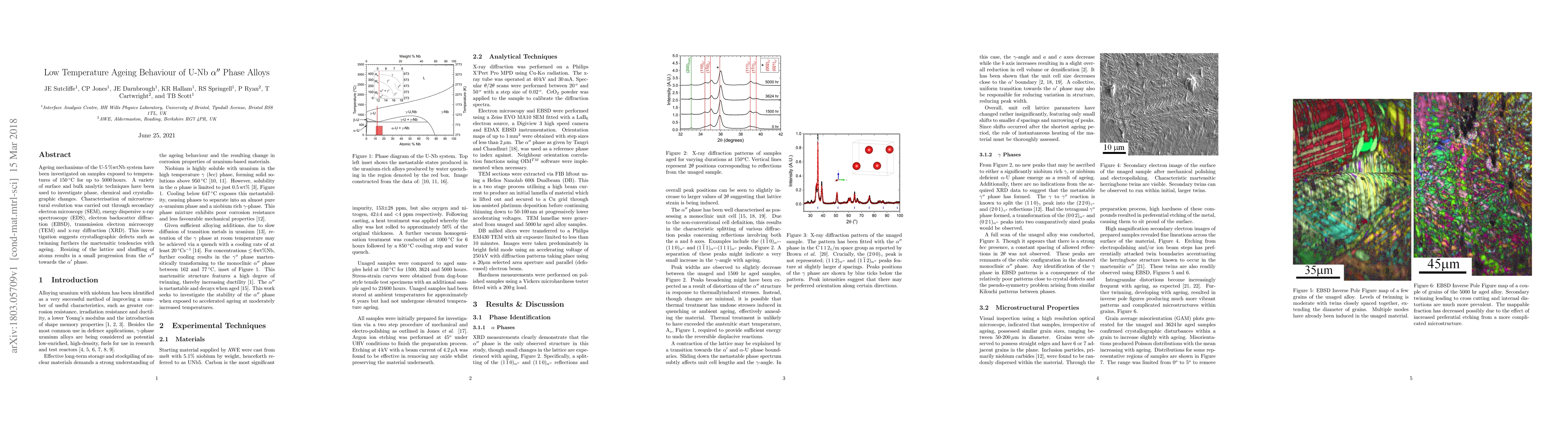 This study examines the ageing behaviour of U-5%wtNb alloys at 150°C for up to 5000 hours, revealing that crystallographic defects like twinning enhance martensitic tendencies. Microstructural changes were analyzed using SEM, EDS, EBSD, TEM, and XRD, showing a slight phase progression from α'' to α'.