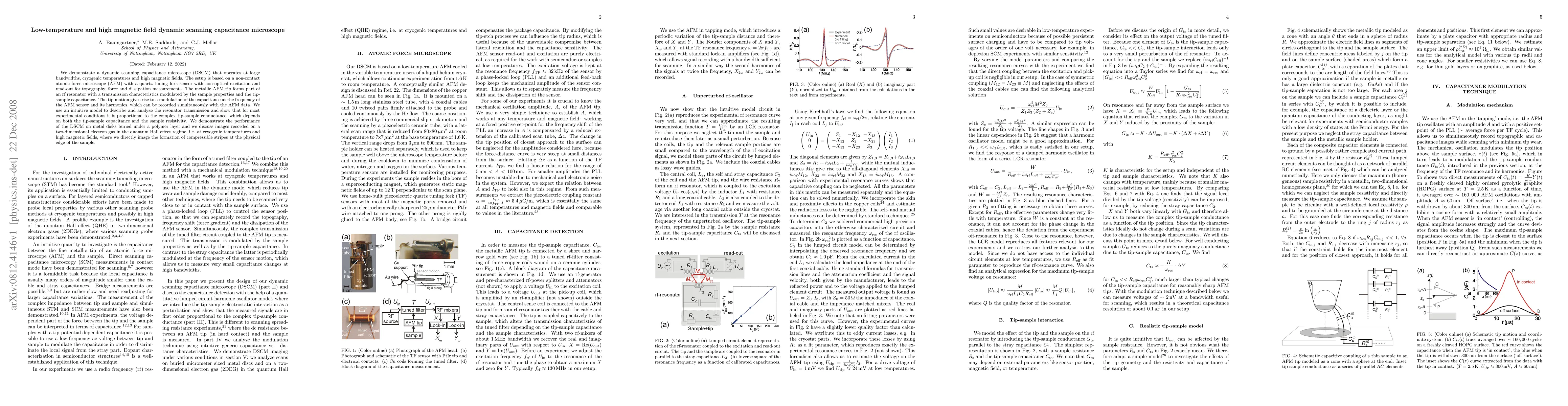 We demonstrate a dynamic scanning capacitance microscope (DSCM) that operates at large bandwidths, cryogenic temperatures and high magnetic fields. The setup is based on a non-contact atomic force microscope (AFM) with a quartz tuning fork sensor with non-optical excitation and read-out for topography, force and dissipation measurements. The metallic AFM tip forms part of an rf resonator with a transmission characteristics modulated by the sample properties and the tip-sample capacitance. The tip motion gives rise to a modulation of the capacitance at the frequency of the AFM sensor and its harmonics, which can be recorded simultaneously with the AFM data. We use an intuitive model to describe and analyze the resonator transmission and show that for most experimental conditions it is proportional to the complex tip-sample conductance, which depends on both the tip-sample capacitance and the sample resistivity. We demonstrate the performance of the DSCM on metal disks buried under a polymer layer and we discuss images recorded on a two-dimensional electron gas in the quantum Hall effect regime, i.e. at cryogenic temperatures and high magnetic fields, where we directly image the formation of compressible stripes at the physical edge of the sample.