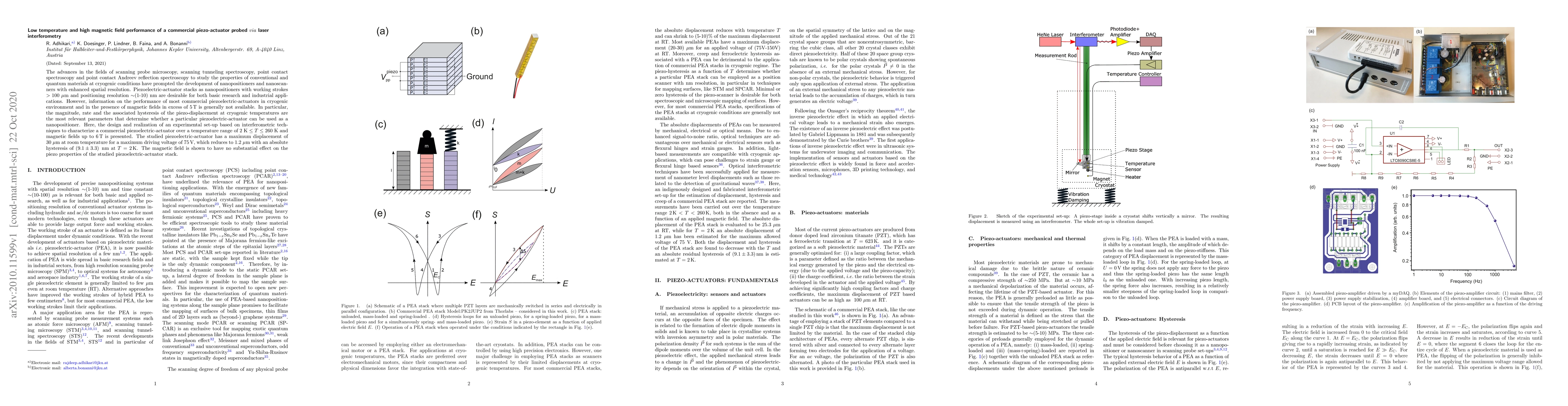 This paper investigates the cryogenic performance and magnetic field effects of a commercial piezoelectric actuator using laser interferometry. The study reveals a significant reduction in maximum displacement and hysteresis at low temperatures, while magnetic fields up to 6 T have negligible impact on its piezo properties.