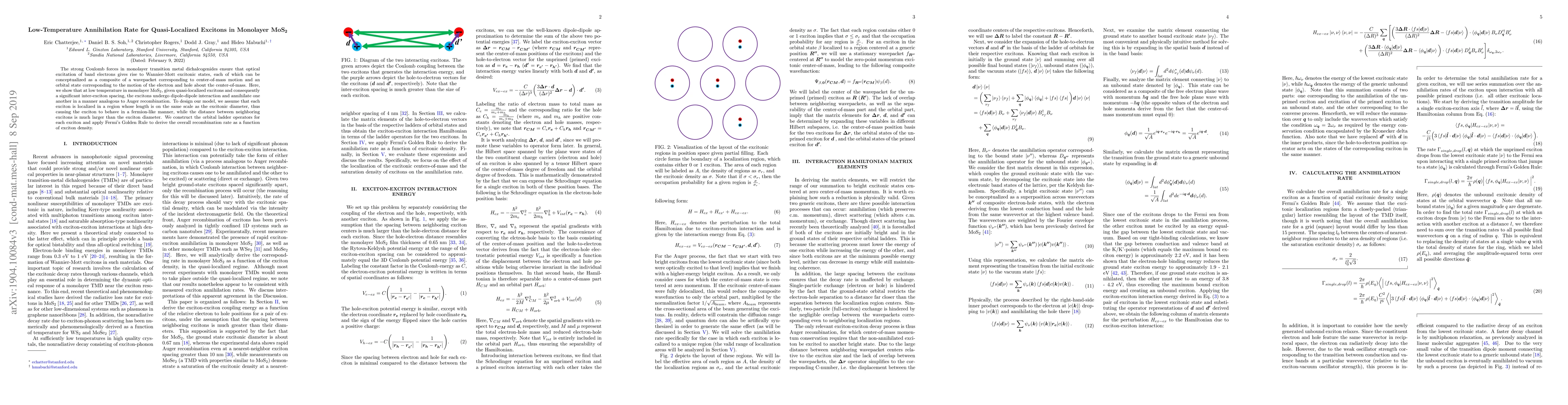 The strong Coulomb forces in monolayer transition metal dichalcogenides ensure that optical excitation of band electrons gives rise to Wannier-Mott excitonic states, each of which can be conceptualized as a composite of a Gaussian wavepacket corresponding to center-of-mass motion and an orbital state corresponding to the motion of the electron and hole about the center-of-mass. Here, we show that at low temperature in monolayer MoS2, given quasi-localized excitons and consequently a significant inter-exciton spacing, the excitons undergo dipole-dipole interaction and annihilate one another in a manner analogous to Auger recombination. To construct our model, we assume that each exciton is localized in a region whose length is on the same scale as the excitonic diameter, thus causing the exciton to behave in a fermionic manner, while the distance between neighboring excitons is much larger than the exciton diameter. We construct the orbital ladder operators for each exciton and apply Fermi's Golden Rule to derive the overall recombination rate as a function of exciton density.