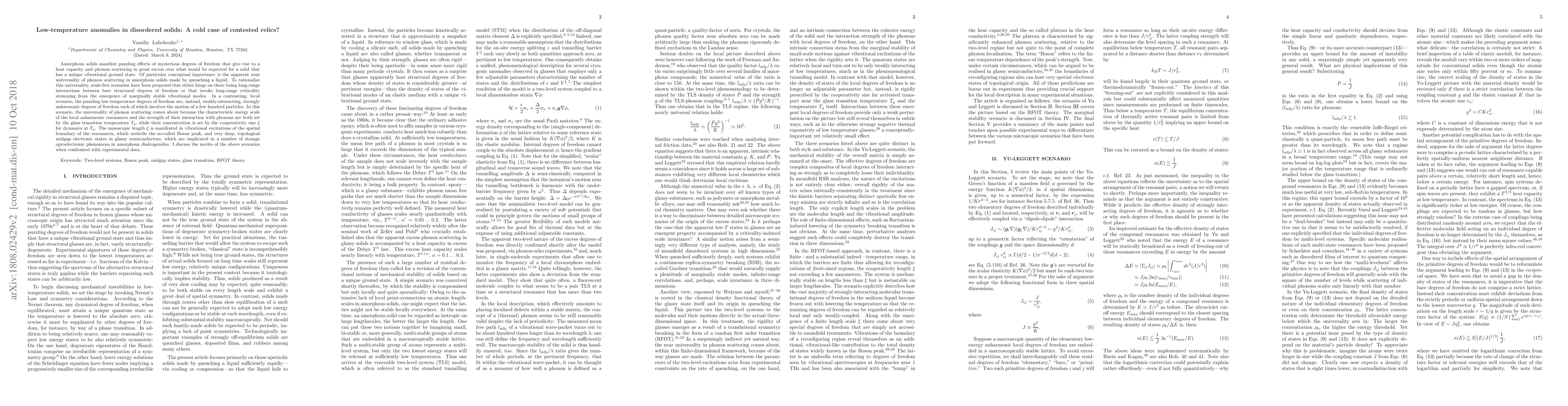 This paper explores the puzzling low-temperature anomalies in disordered solids, particularly the excess heat capacity and phonon scattering, and debates the underlying mechanisms. It contrasts scale-free, long-range interaction models with local, strongly anharmonic models, and evaluates these theories against experimental data.