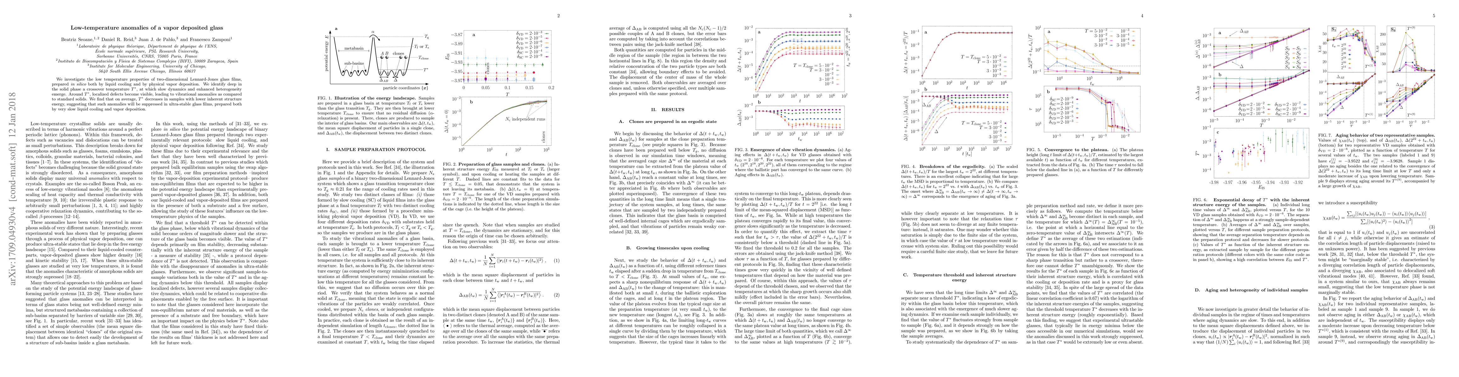 We investigate the low temperature properties of two-dimensional Lennard-Jones glass films, prepared in silico both by liquid cooling and by physical vapor deposition. We identify deep in the solid phase a crossover temperature $T^*$, at which slow dynamics and enhanced heterogeneity emerge. Around $T^*$, localized defects become visible, leading to vibrational anomalies as compared to standard solids. We find that on average, $T^*$ decreases in samples with lower inherent structure energy, suggesting that such anomalies will be suppressed in ultra-stable glass films, prepared both by very slow liquid cooling and vapor deposition.