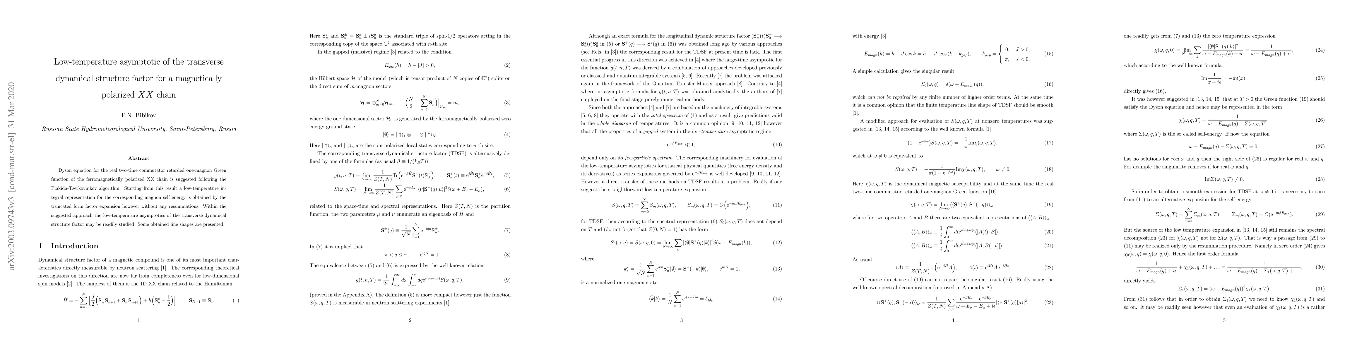 Dyson equation for the real two-time commutator retarded one-magnon Green function of the ferromagnetically polarized XX chain is suggested following the Plakida-Tserkovnikov algorithm. Starting from this result a low-temperature integral representation for the corresponding magnon self energy is obtained by the truncated form factor expansion however without any resummations. Within the suggested approach the low-temperature asymptotics of the transverse dynamical structure factor may be readily studied. Some obtained line shapes are presented.