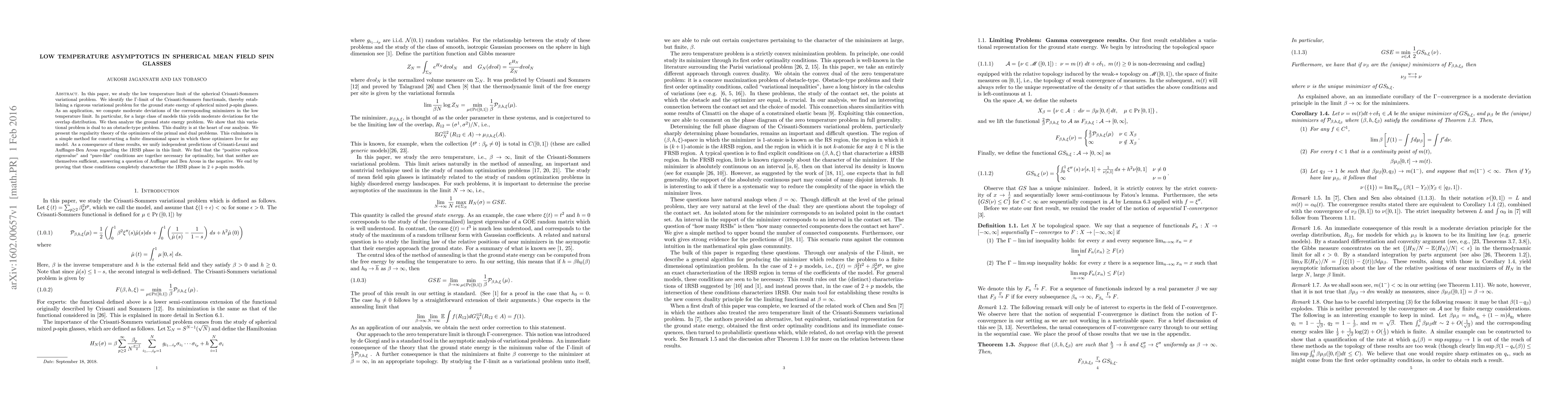 In this paper, we study the low temperature limit of the spherical Crisanti-Sommers variational problem. We identify the $\Gamma$-limit of the Crisanti-Sommers functionals, thereby establishing a rigorous variational problem for the ground state energy of spherical mixed $p$-spin glasses. As an application, we compute moderate deviations of the corresponding minimizers in the low temperature limit. In particular, for a large class of models this yields moderate deviations for the overlap distribution. We then analyze the ground state energy problem. We show that this variational problem is dual to an obstacle-type problem. This duality is at the heart of our analysis. We present the regularity theory of the optimizers of the primal and dual problems. This culminates in a simple method for constructing a finite dimensional space in which these optimizers live for any model. As a consequence of these results, we unify independent predictions of Crisanti-Leuzzi and Auffinger-Ben Arous regarding the 1RSB phase in this limit. We find that the "positive replicon eigenvalue" and "pure-like" conditions are together necessary for optimality, but that neither are themselves sufficient, answering a question of Auffinger and Ben Arous in the negative. We end by proving that these conditions completely characterize the 1RSB phase in $2+p$-spin models.