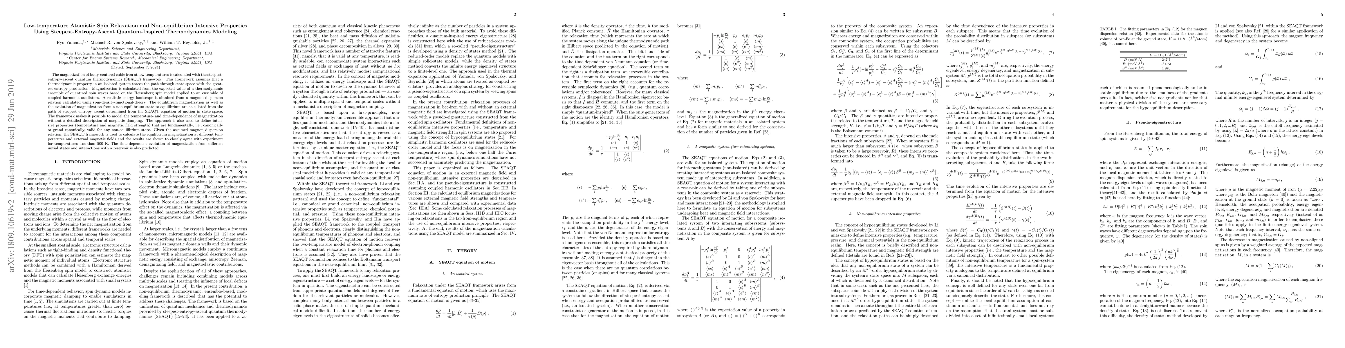 The magnetization of body-centered cubic iron at low temperatures is calculated with the steepest-entropy-ascent quantum thermodynamics (SEAQT) framework. This framework assumes that a thermodynamic property in an isolated system traces the path through state space with the greatest entropy production. Magnetization is calculated from the expected value of a thermodynamic ensemble of quantized spin waves based on the Heisenberg spin model applied to an ensemble of coupled harmonic oscillators. A realistic energy landscape is obtained from a magnon dispersion relation calculated using spin-density-functional-theory. The equilibrium magnetization as well as the evolution of magnetization from a non-equilibrium state to equilibrium are calculated from the path of steepest entropy ascent determined from the SEAQT equation of motion in state space. The framework makes it possible to model the temperature- and time-dependence of magnetization without a detailed description of magnetic damping. The approach is also used to define intensive properties (temperature and magnetic field strength) that are fundamentally, i.e., canonically or grand canonically, valid for any non-equilibrium state. Given the assumed magnon dispersion relation, the SEAQT framework is used to calculate the equilibrium magnetization at different temperatures and external magnetic fields and the results are shown to closely agree with experiment for temperatures less than 500 K. The time-dependent evolution of magnetization from different initial states and interactions with a reservoir is also predicted.