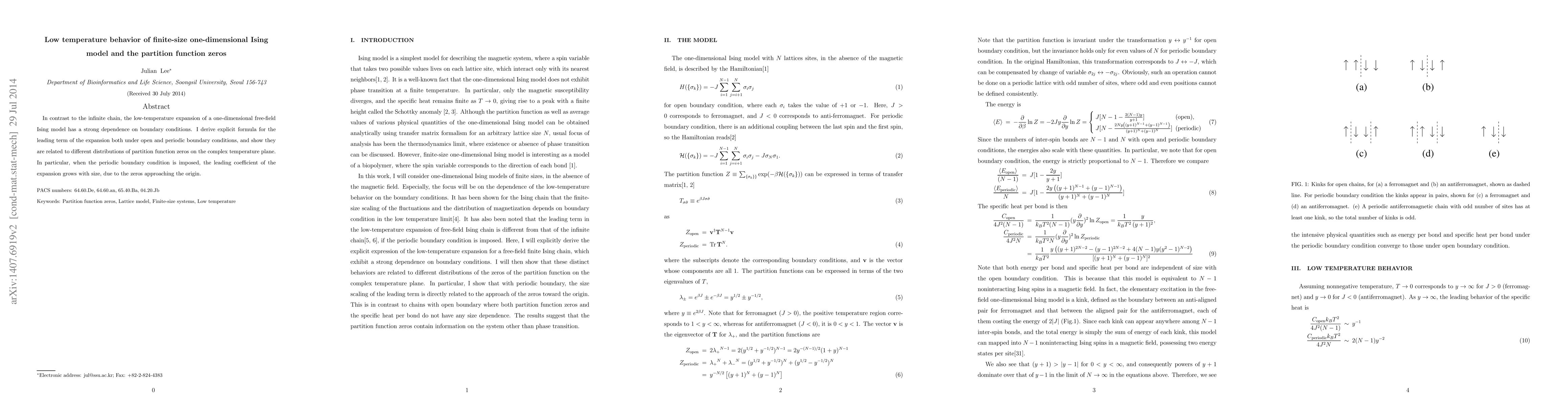 Summary: This study derives explicit formulas for the leading low-temperature expansion terms of a finite-size one-dimensional Ising model under open and periodic boundary conditions, revealing a connection between these expansions and the distribution of partition function zeros on the complex temperature plane, with periodic boundary conditions causing zeros to cluster near the origin.