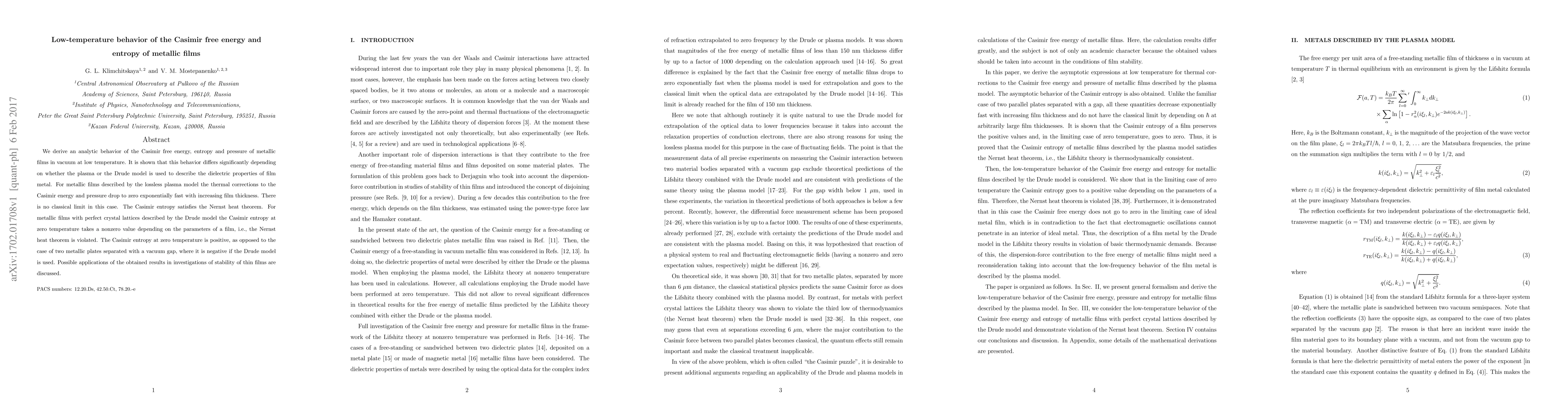This paper analyzes the low-temperature behavior of the Casimir free energy, entropy, and pressure in metallic films, showing significant differences based on whether the plasma or Drude model is used. The plasma model results in zero thermal corrections for thick films, while the Drude model leads to a nonzero Casimir entropy at zero temperature, violating the Nernst heat theorem.