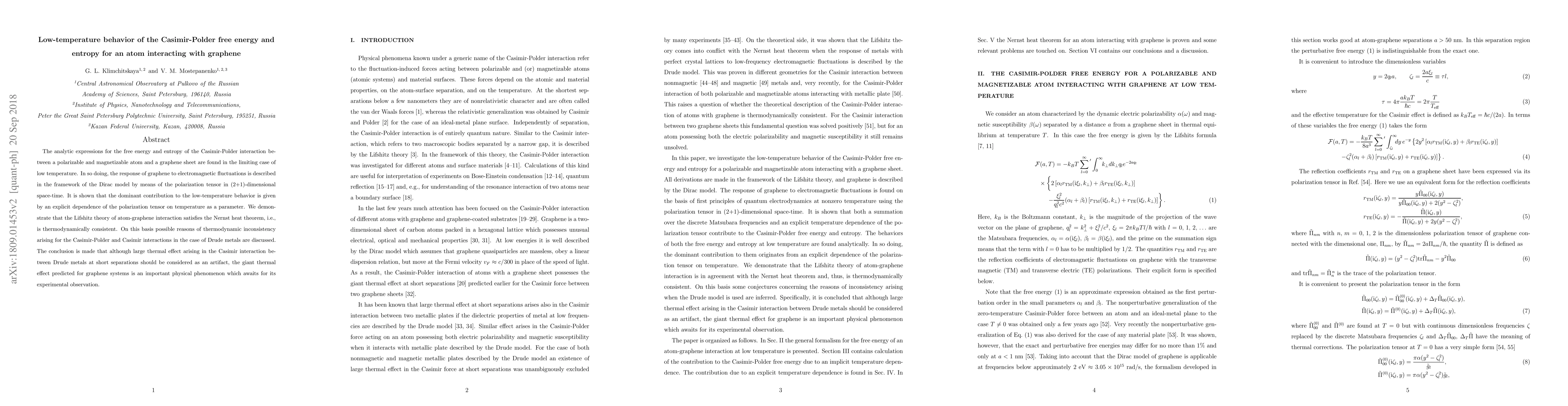 This paper derives analytic expressions for the Casimir-Polder free energy and entropy at low temperatures for an atom interacting with graphene, showing that the polarization tensor's temperature dependence is crucial. It confirms the thermodynamic consistency of the Lifshitz theory for atom-graphene interaction and suggests that the significant thermal effect in graphene systems is a genuine physical phenomenon.