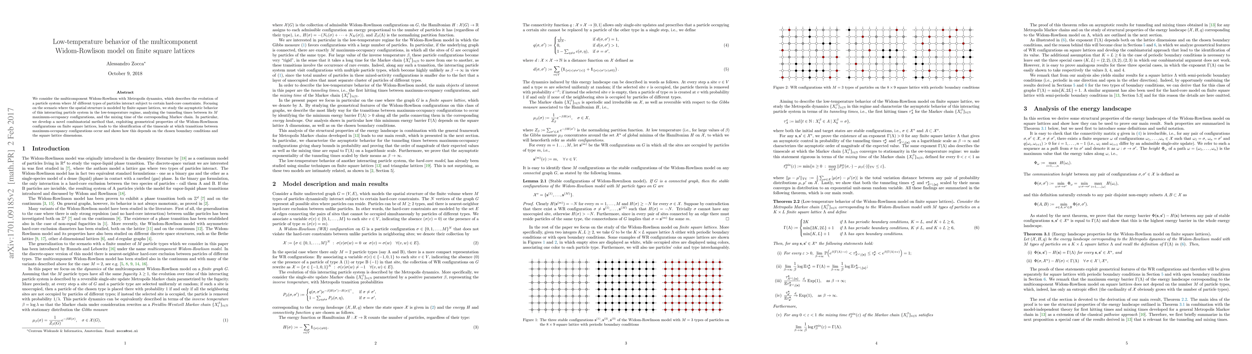 We consider the multicomponent Widom-Rowlison with Metropolis dynamics, which describes the evolution of a particle system where $M$ different types of particles interact subject to certain hard-core constraints. Focusing on the scenario where the spatial structure is modeled by finite square lattices, we study the asymptotic behavior of this interacting particle system in the low-temperature regime, analyzing the tunneling times between its $M$ maximum-occupancy configurations, and the mixing time of the corresponding Markov chain. In particular, we develop a novel combinatorial method that, exploiting geometrical properties of the Widom-Rowlinson configurations on finite square lattices, leads to the identification of the timescale at which transitions between maximum-occupancy configurations occur and shows how this depends on the chosen boundary conditions and the square lattice dimensions.