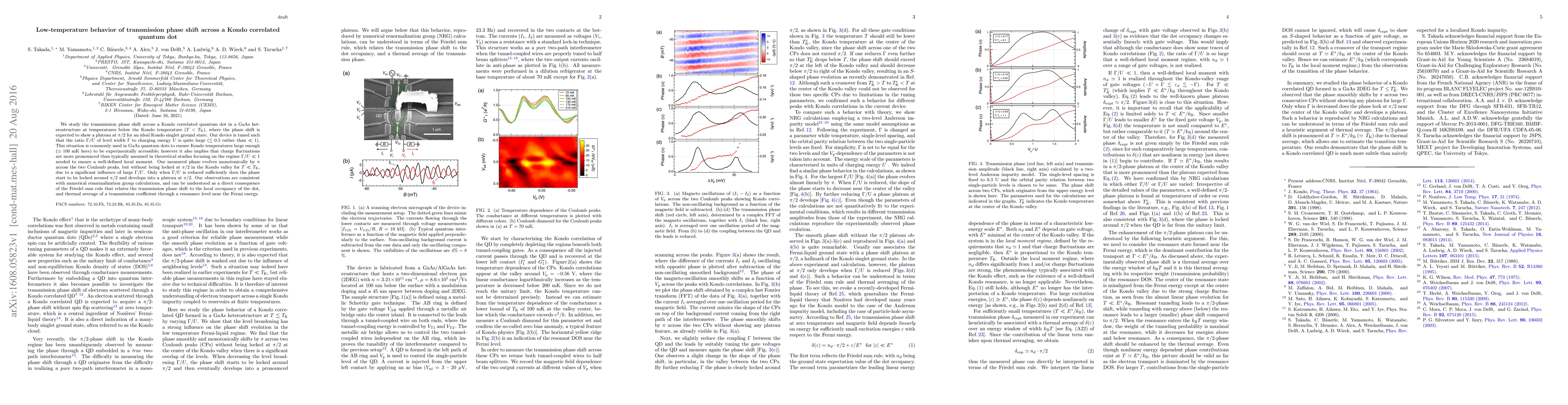 This study investigates the transmission phase shift across a Kondo correlated quantum dot in GaAs at low temperatures, finding that the phase shift does not plateau at $\pi/2$ due to a large ratio $\Gamma/U$. Only when $\Gamma/U$ is sufficiently reduced does the phase shift lock around $\pi/2$, consistent with numerical renormalization group calculations and Friedel sum rule implications.