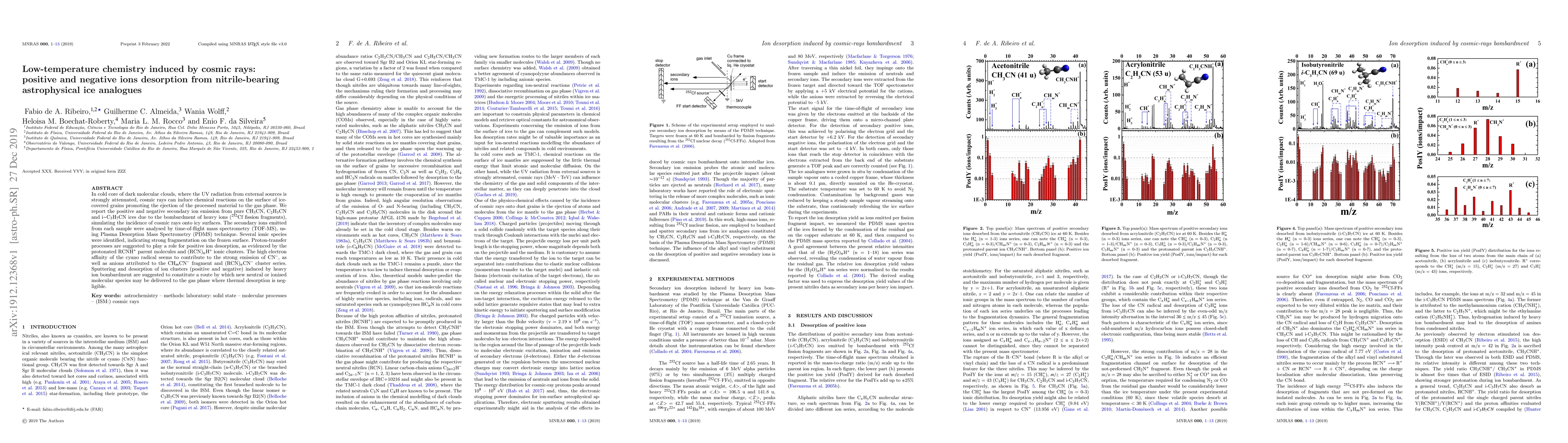 This study investigates the low-temperature chemical reactions induced by cosmic rays on nitrile-bearing astrophysical ice analogues, revealing significant positive and negative ion desorption via heavy ion bombardment. The findings suggest proton-transfer processes and high electron affinity of cyano radicals contribute to the emission of various ionic species, indicating a potential pathway for delivering new molecular species into the gas phase.