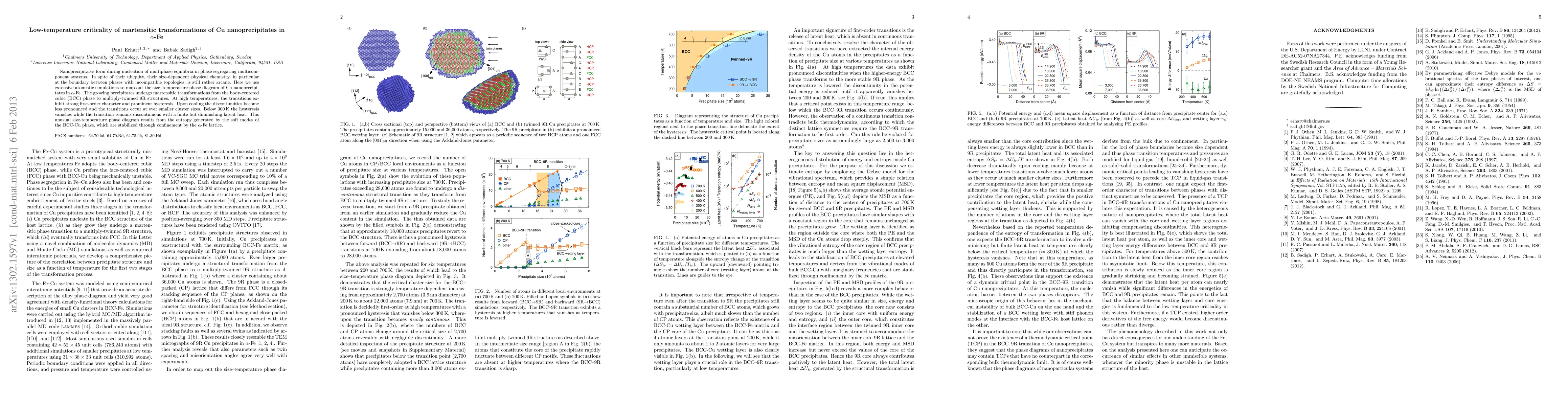 This study uses atomistic simulations to explore the martensitic transformations in Cu nanoprecipitates within \alpha-Fe, revealing that transitions become less pronounced and occur at smaller sizes upon cooling. Below 300 K, hysteresis vanishes, but the transition remains discontinuous due to entropy generated by the BCC-Cu phase's soft modes.