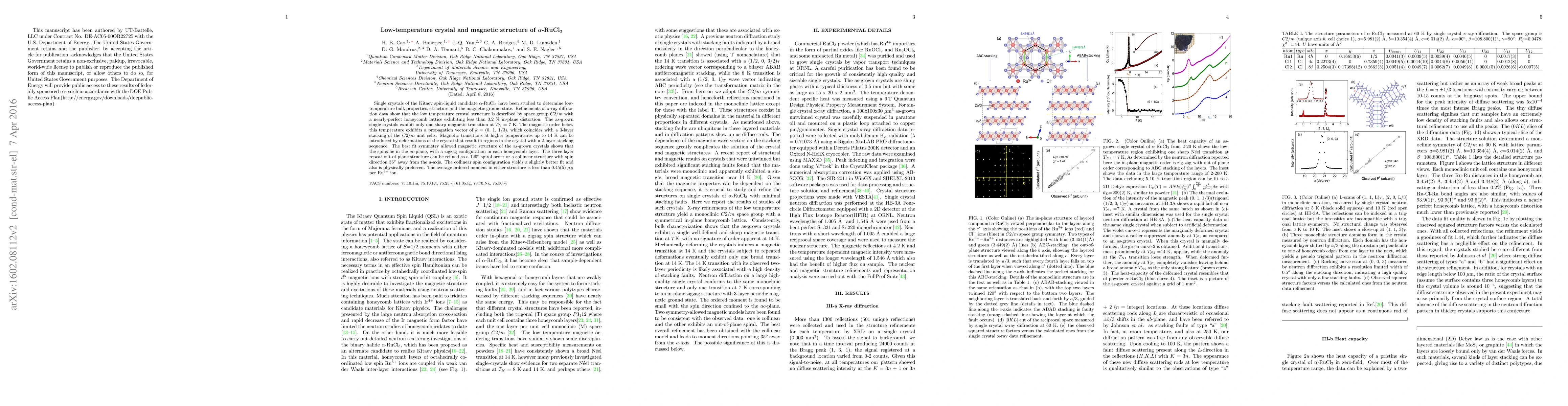 Single crystals of the Kitaev spin-liquid candidate $\alpha$-RuCl$_3$ have been studied to determine low-temperature bulk properties, structure and the magnetic ground state. Refinements of x-ray diffraction data show that the low temperature crystal structure is described by space group $C2/m$ with a nearly-perfect honeycomb lattice exhibiting less than 0.2 \% in-plane distortion. The as-grown single crystals exhibit only one sharp magnetic transition at $T_{N}$ = 7~K. The magnetic order below this temperature exhibits a propagation vector of $k$ = (0, 1, 1/3), which coincides with a 3-layer stacking of the $C2/m$ unit cells. Magnetic transitions at higher temperatures up to 14~K can be introduced by deformations of the crystal that result in regions in the crystal with a 2-layer stacking sequence. The best fit symmetry allowed magnetic structure of the as-grown crystals shows that the spins lie in the $ac$-plane, with a zigzag configuration in each honeycomb layer. The three layer repeat out-of-plane structure can be refined as a 120$^o$ spiral order or a collinear structure with spin direction 35$^o$ away from the $a$-axis. The collinear spin configuration yields a slightly better fit and also is physically preferred. The average ordered moment in either structure is less than 0.45(5) $\mu_B$ per Ru$^{3+}$ ion.