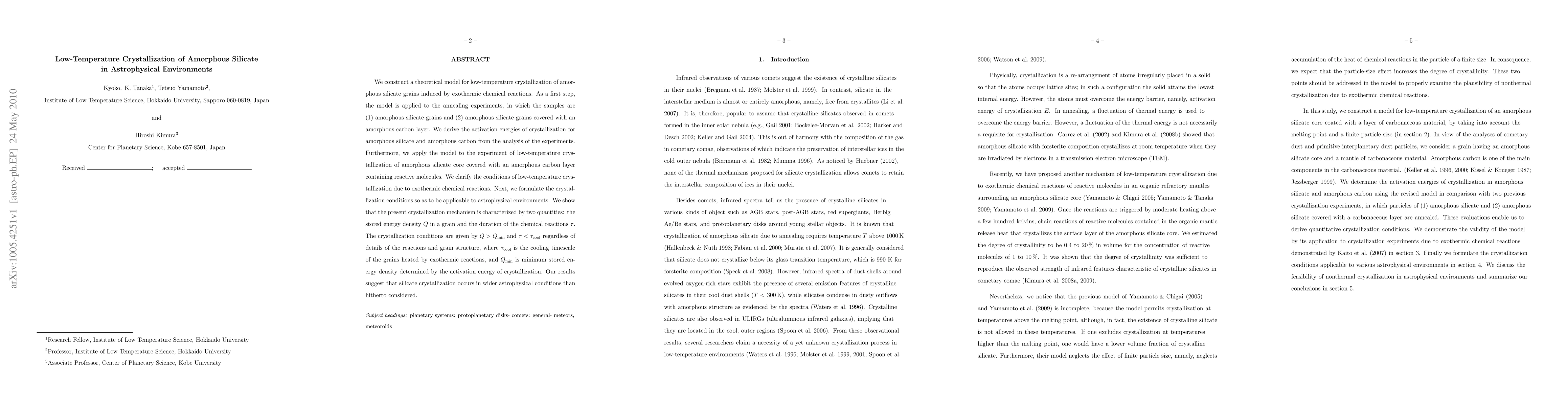 This paper develops a theoretical model for low-temperature crystallization of amorphous silicate grains driven by exothermic chemical reactions, showing that crystallization depends on stored energy density and reaction duration, and suggests that silicate crystallization can occur under a broader range of astrophysical conditions than previously thought.