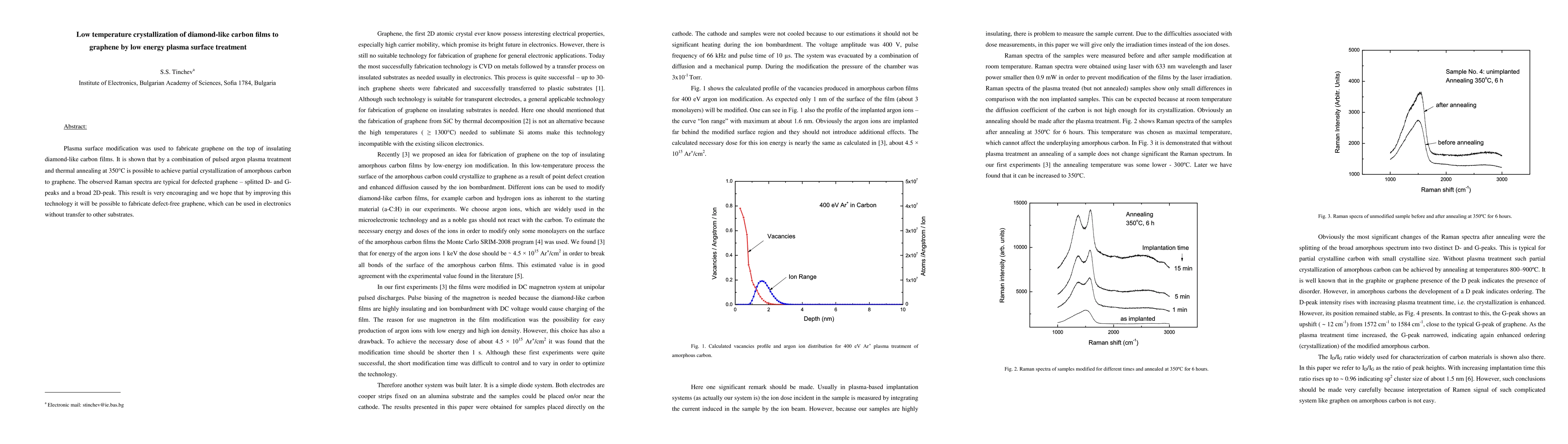 This study demonstrates the successful conversion of diamond-like carbon films into graphene via low-energy plasma treatment and thermal annealing at 350°C. The resulting graphene exhibits typical Raman spectra indicative of defected graphene, suggesting potential for future advancements to produce defect-free graphene for electronic applications.