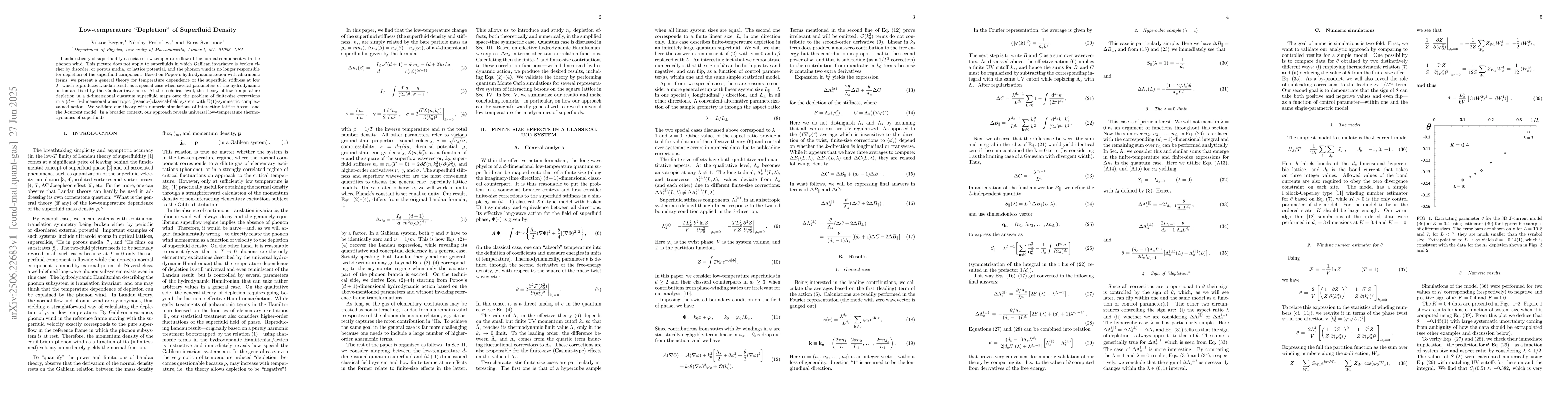 Landau theory of superfluidity associates low-temperature flow of the normal component with the phonon wind. This picture does not apply to superfluids in which Galilean invariance is broken either by disorder, or porous media, or lattice potential, and the phonon wind is no longer responsible for depletion of the superfluid component. Based on Popov's hydrodynamic action with aharmonic terms, we present a general theory for temperature dependence of the superfluid stiffness at low $T$, which reproduces Landau result as a special case when several parameters of the hydrodynamic action are fixed by the Galilean invariance. At the technical level, the theory of low-temperature depletion in a $d$-dimensional quantum superfluid maps onto the problem of finite-size corrections in a $(d+1)$-dimensional anisotropic (pseudo-)classical-field system with U(1)-symmetric complex-valued action. We validate our theory with numeric simulations of interacting lattice bosons and the J-current model. In a broader context, our approach reveals universal low-temperature thermodynamics of superfluids.