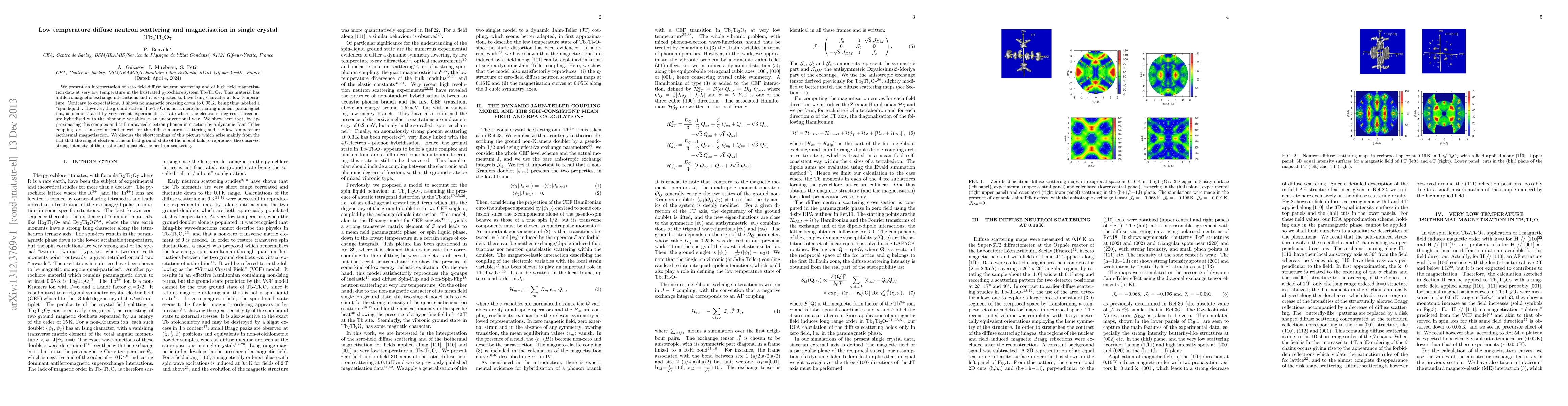 We present an interpretation of zero field diffuse neutron scattering and of high field magnetisation data at very low temperature in the frustrated pyrochlore system Tb2Ti2O7. This material has antiferromagnetic exchange interactions and it is expected to have Ising character at low temperature. Contrary to expectations, it shows no magnetic ordering down to 0.05\,K, being thus labelled a "spin liquid". However, the ground state in Tb2Ti2O7 is not a mere fluctuating moment paramagnet but, as demonstrated by very recent experiments, a state where the electronic degrees of freedom are hybridised with the phononic variables in an unconventional way. We show here that, by approximating this complex and still unraveled electron-phonon interaction by a dynamic Jahn-Teller coupling, one can account rather well for the diffuse neutron scattering and the low temperature isothermal magnetisation. We discuss the shortcomings of this picture which arise mainly from the fact that the singlet electronic mean field ground state of the model fails to reproduce the observed strong intensity of the elastic and quasi-elastic neutron scattering.