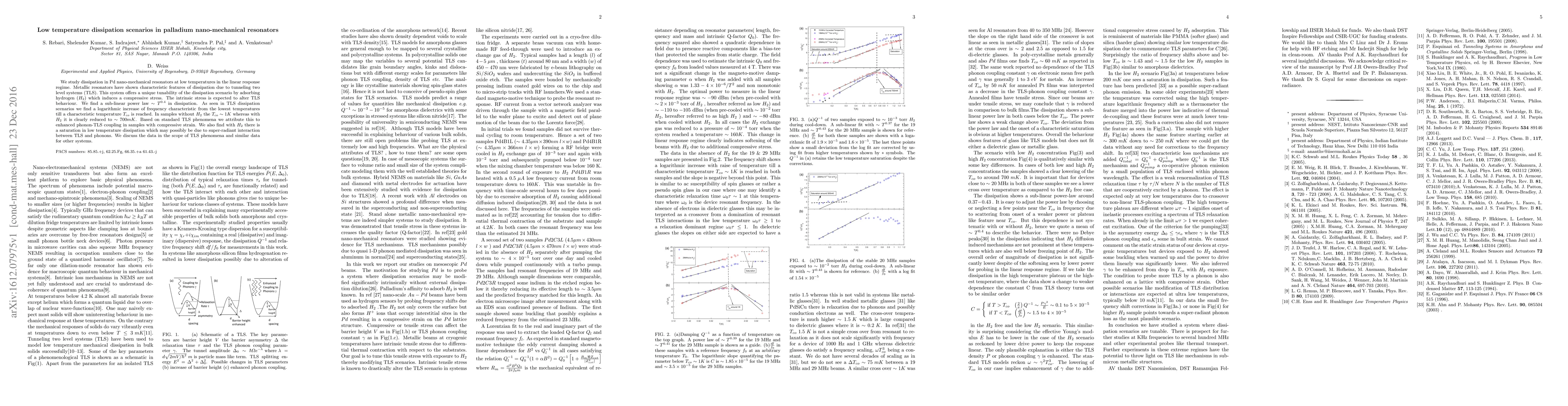 This study investigates low temperature dissipation in palladium nano-mechanical resonators, revealing a sub-linear power law $\sim T^{0.4}$ and a logarithmic frequency increase due to tunneling two level systems (TLS). The adsorption of hydrogen ($H_2$) induces compressive strain, reducing the characteristic temperature $T_{co}$ and potentially leading to super-radiant interaction between TLS and phonons.