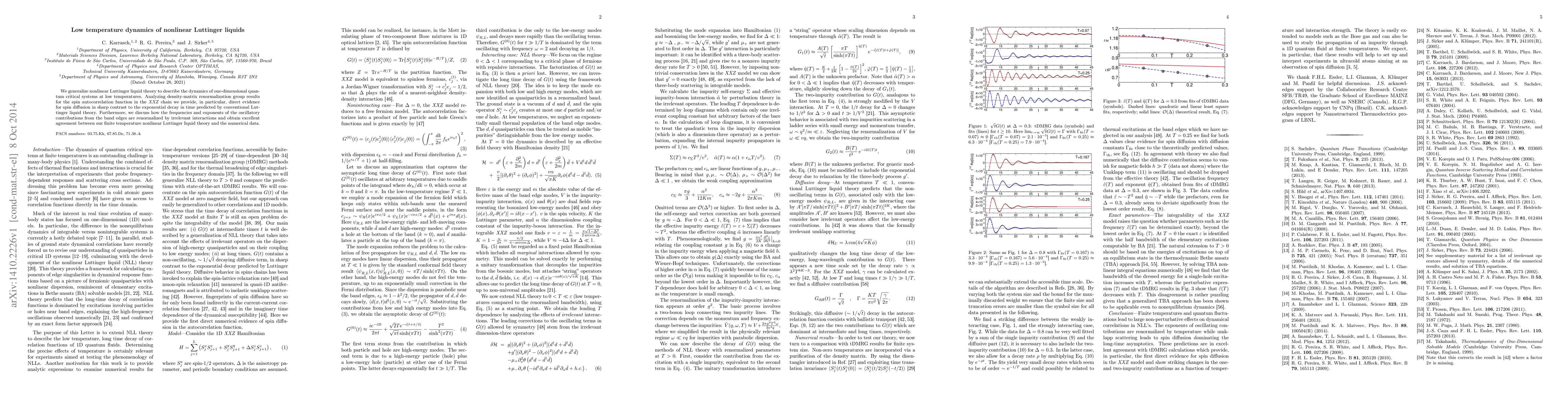 We generalize nonlinear Luttinger liquid theory to describe the dynamics of one-dimensional quantum critical systems at low temperatures. Analyzing density-matrix renormalization group results for the spin autocorrelation function in the XXZ chain we provide, in particular, direct evidence for spin diffusion in sharp contrast to the exponential decay in time predicted by conventional Luttinger liquid theory. Furthermore, we discuss how the frequencies and exponents of the oscillatory contributions from the band edges are renormalized by irrelevant interactions and obtain excellent agreement between our finite temperature nonlinear Luttinger liquid theory and the numerical data.