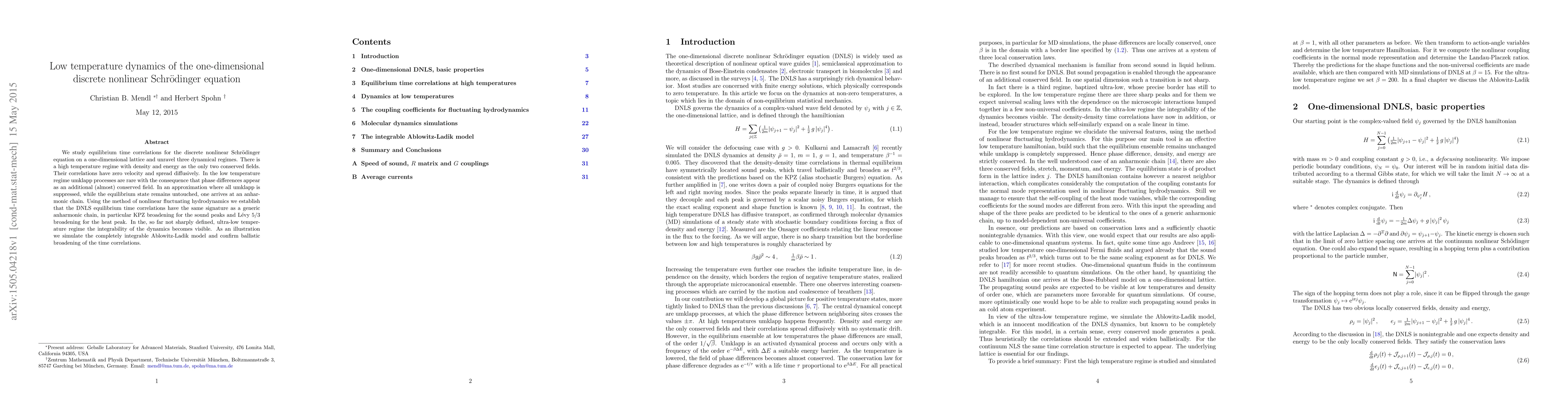 We study equilibrium time correlations for the discrete nonlinear Schr\"odinger equation on a one-dimensional lattice and unravel three dynamical regimes. There is a high temperature regime with density and energy as the only two conserved fields. Their correlations have zero velocity and spread diffusively. In the low temperature regime umklapp processes are rare with the consequence that phase differences appear as an additional (almost) conserved field. In an approximation where all umklapp is suppressed, while the equilibrium state remains untouched, one arrives at an anharmonic chain. Using the method of nonlinear fluctuating hydrodynamics we establish that the DNLS equilibrium time correlations have the same signature as a generic anharmonic chain, in particular KPZ broadening for the sound peaks and L\'evy 5/3 broadening for the heat peak. In the, so far not sharply defined, ultra-low temperature regime the integrability of the dynamics becomes visible. As an illustration we simulate the completely integrable Ablowitz-Ladik model and confirm ballistic broadening of the time correlations.